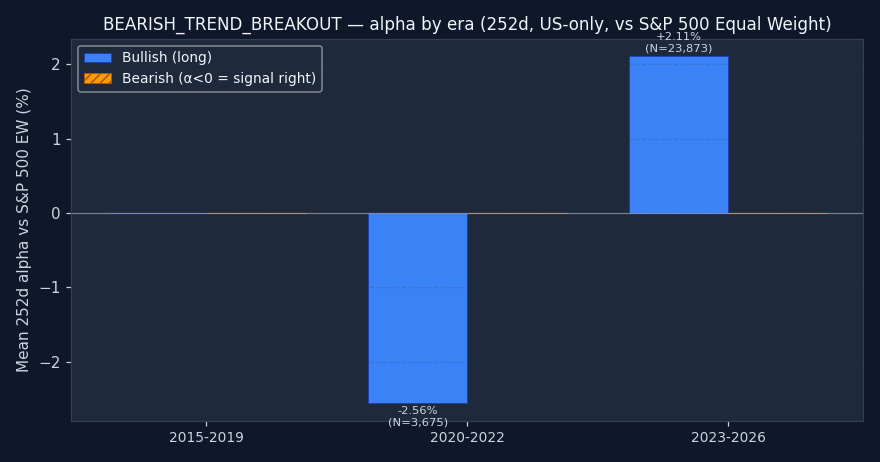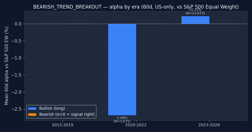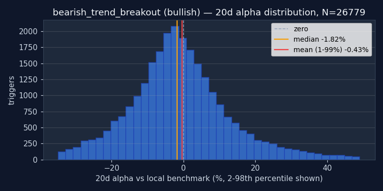 Caution recommended. Bullish 20d alpha is -0.43% and worse than random — triggering on random dates would have produced better long-side returns. Either direction fails the "beats random" test. Don't use Bearish Trend Breakout as a standalone entry trigger. It may still be useful as part of a composite (section 4).