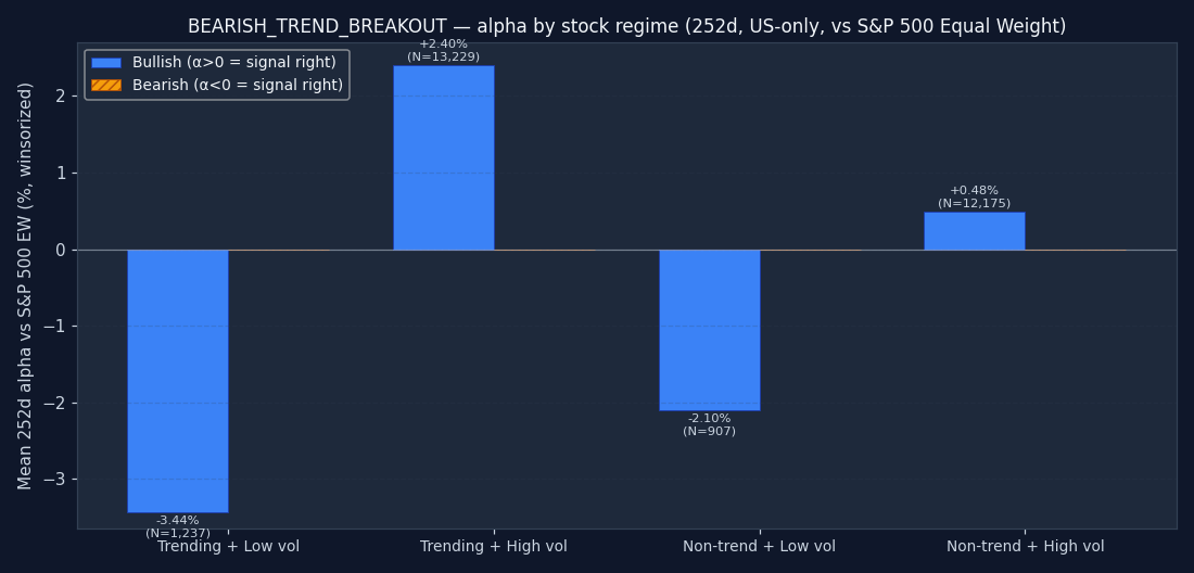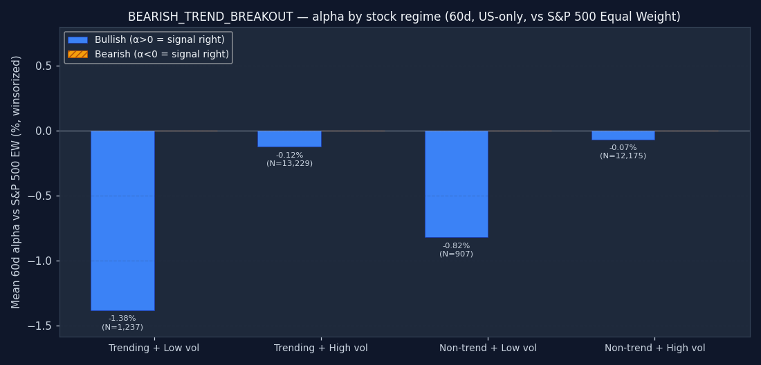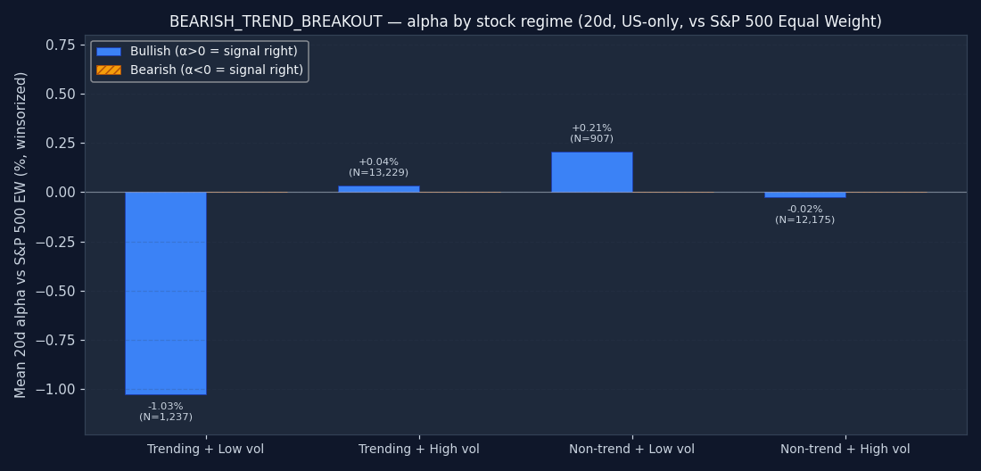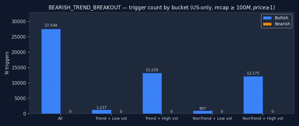 The signal's bucket distribution is itself informative. If 50%+ of all BEARISH_TREND_BREAKOUT triggers fire in the "non-trending + high vol" quadrant, the signal is structurally a chop-market event — regardless of what its textbook definition claims. Bullish and bearish are shown separately; counts are across the full US-only sample after the mcap and price floor.