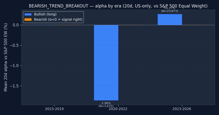 - Best era for bullish: 2023-2026 — alpha -0.25% / 20d.