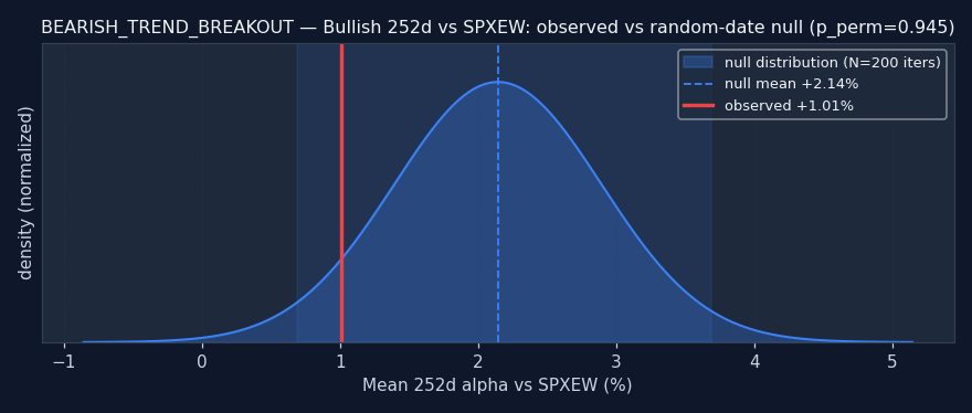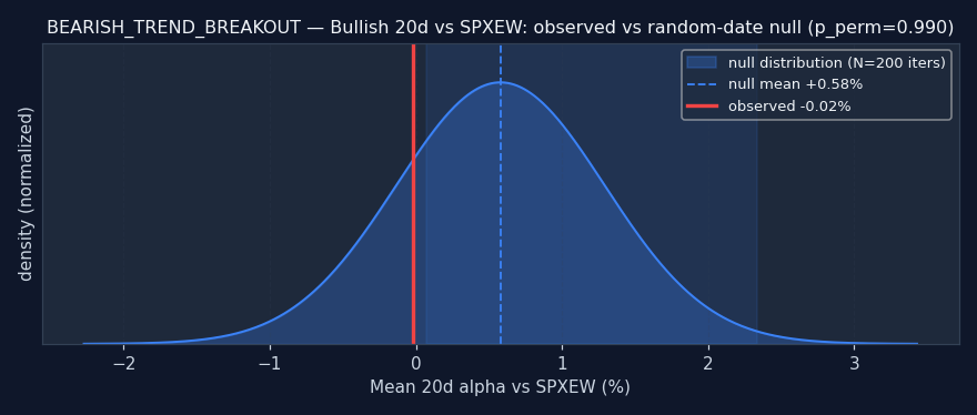 Reading this: the random-date null is: for each ticker, sample N random dates and compute the same alpha — what alpha does a signal with no information produce? If the signal's observed alpha beats the null (pperm≤0.05), it's adding real information. If it's inside or worse than the null, the signal doesn't add value over random firing — any observed alpha is either noise or a universe artifact.