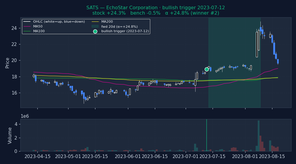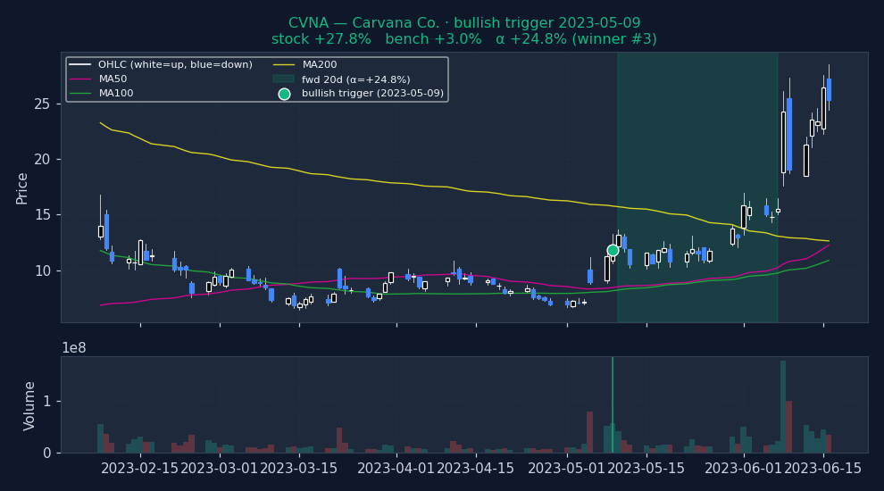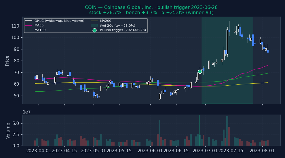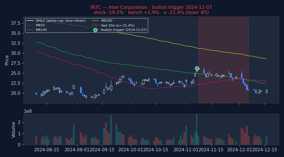 Six recent bullish BEARISH_TREND_BREAKOUT triggers on US mega-caps, filtered to |alpha| ≤ 25% to exclude catalyst-driven outliers (earnings surprises, M&A, binary events). The first three are the strongest outcomes — what the signal looks like when it works. The last three are the weakest — what the signal looks like when it fails. Each chart shows the stock's price with signal-appropriate technical overlays (e.g. MACD subpanel on MACD pages, Bollinger Bands on Bollinger pages, the 52-week trailing max line on 52w-high pages), a dot marking the trigger date, and the forward window shaded (green when the signal was right, red when it wasn't). Click any chart to open full-size.