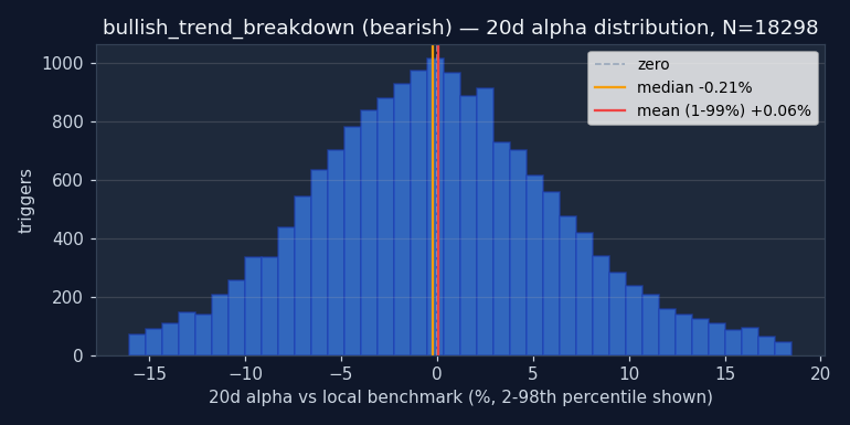 How to read. Entry at open of T+1 (one trading day after the signal fires on close of T). 20d = open T+1 to close T+20. Alpha = stock return − benchmark return over the same window (Convention A, single-sided, textbook). For bullish triggers, POSITIVE alpha = signal was right. For bearish triggers, NEGATIVE alpha = signal was right (stock underperformed market). No sign-flipping; the direction of the bet determines what "good" looks like. Per-stock regime is each stock's own ADX(14) and RV(20) at the trigger date — not market-wide state.