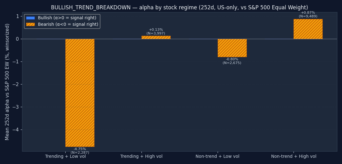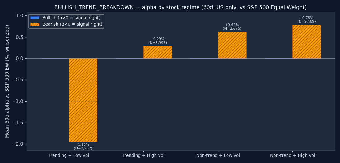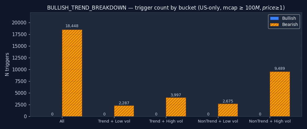 The signal's bucket distribution is itself informative. If 50%+ of all BULLISH_TREND_BREAKDOWN triggers fire in the "non-trending + high vol" quadrant, the signal is structurally a chop-market event — regardless of what its textbook definition claims. Bullish and bearish are shown separately; counts are across the full US-only sample after the mcap and price floor.