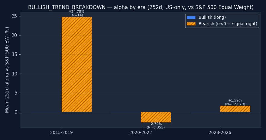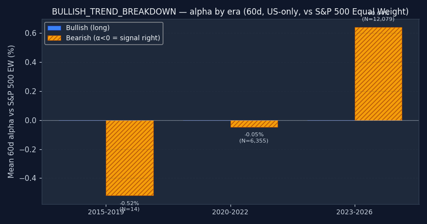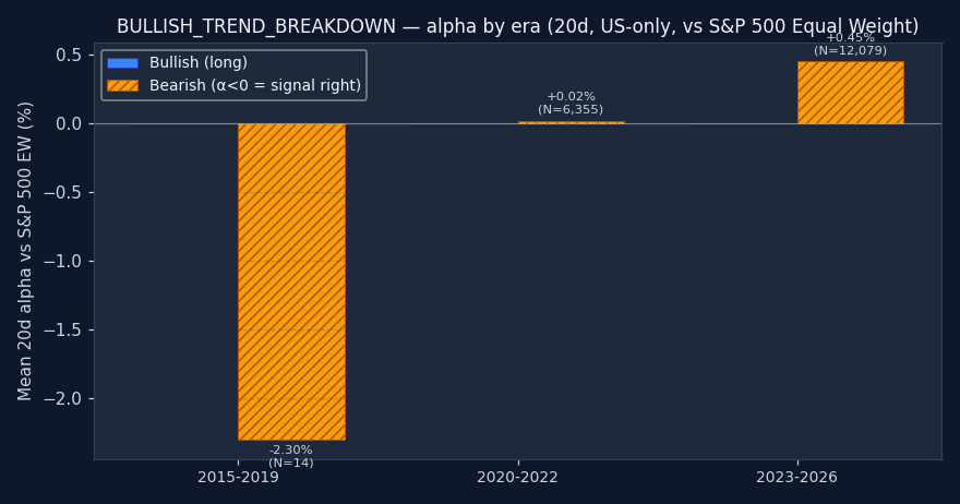 - Best era for bearish: 2020-2022 — alpha +0.31% / 20d.