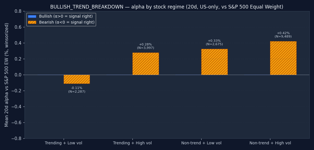 - Weakest bearish cell: Trending + Low vol — alpha -0.42% / 20d on 2,287 triggers.