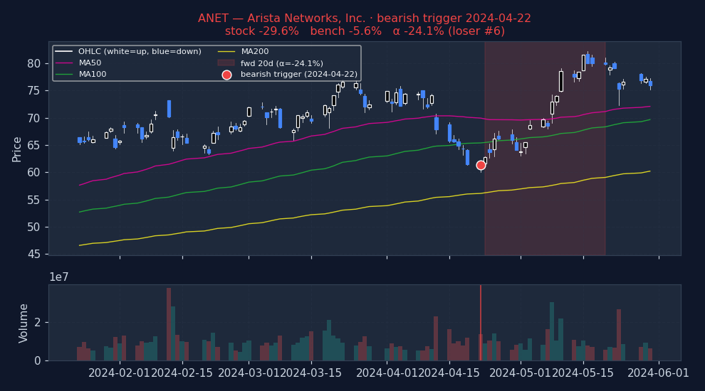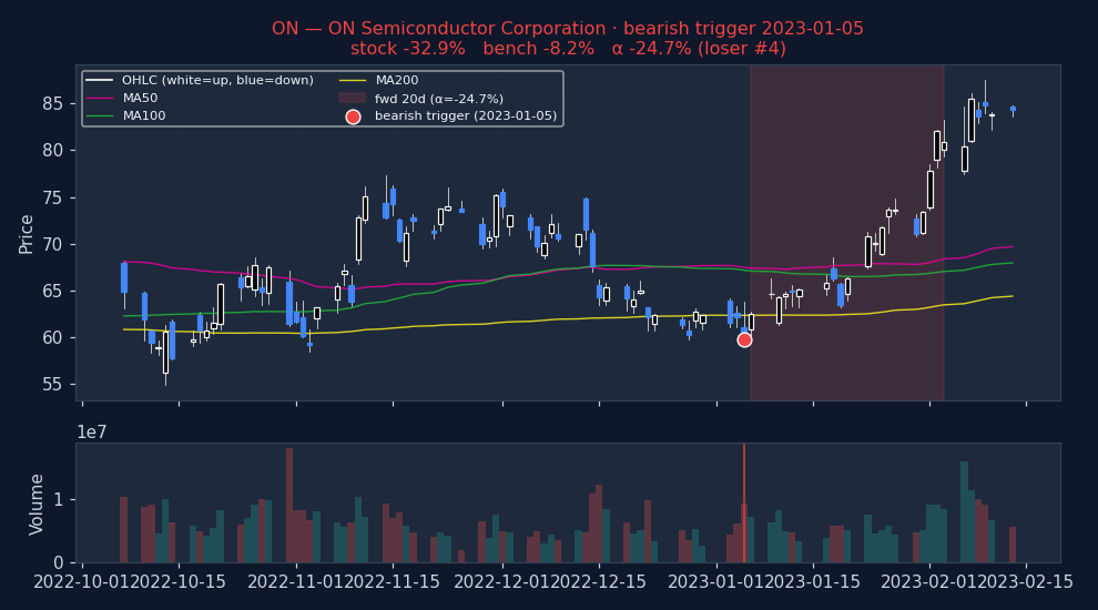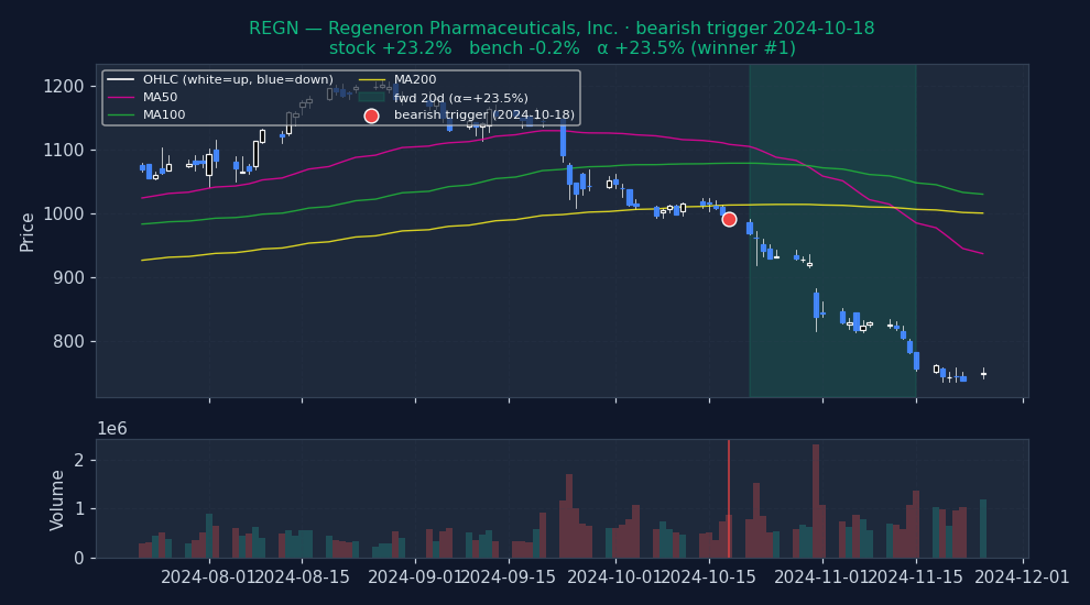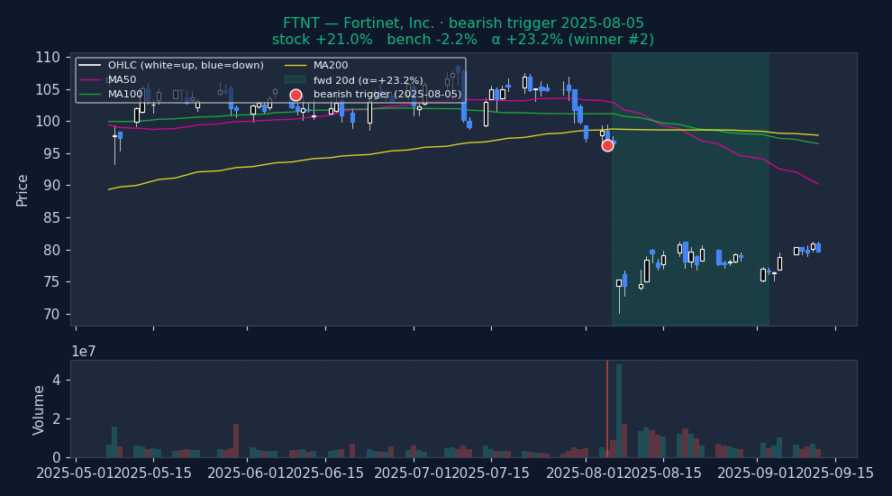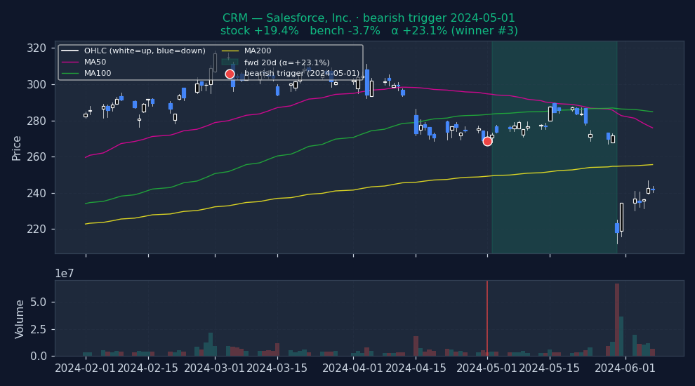 Six recent bearish BULLISH_TREND_BREAKDOWN triggers on US mega-caps, filtered to |alpha| ≤ 25% to exclude catalyst-driven outliers (earnings surprises, M&A, binary events). The first three are the strongest outcomes — what the signal looks like when it works. The last three are the weakest — what the signal looks like when it fails. Each chart shows the stock's price with signal-appropriate technical overlays (e.g. MACD subpanel on MACD pages, Bollinger Bands on Bollinger pages, the 52-week trailing max line on 52w-high pages), a dot marking the trigger date, and the forward window shaded (green when the signal was right, red when it wasn't). Click any chart to open full-size.