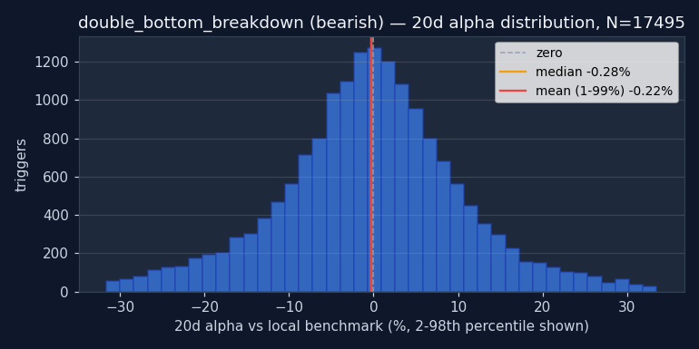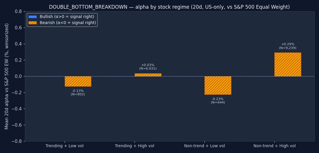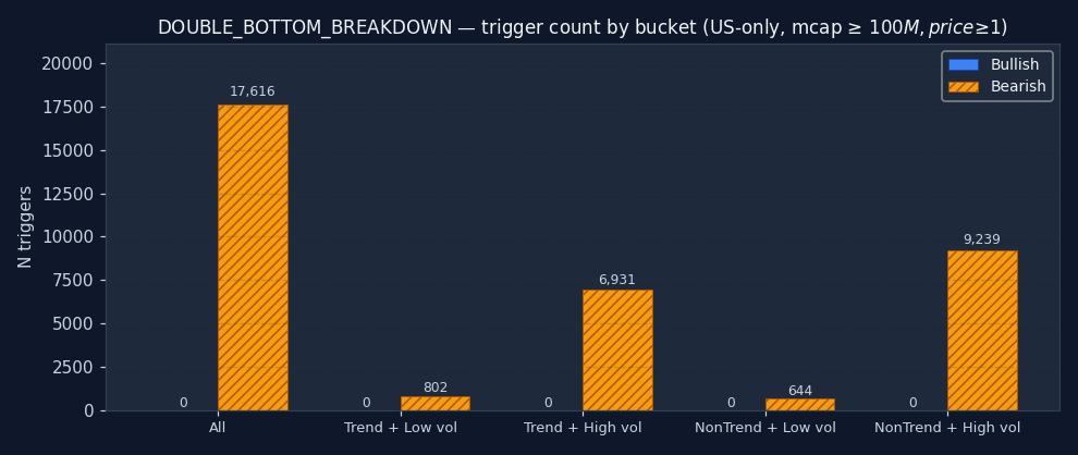 The signal's bucket distribution is itself informative. If 50%+ of all DOUBLE_BOTTOM_BREAKDOWN triggers fire in the "non-trending + high vol" quadrant, the signal is structurally a chop-market event — regardless of what its textbook definition claims. Bullish and bearish are shown separately; counts are across the full US-only sample after the mcap and price floor.