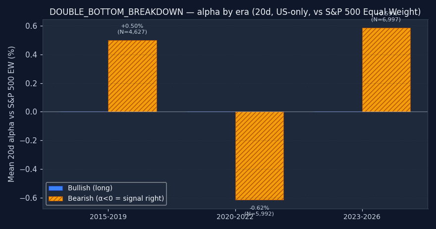 - Worst era for bearish: 2020-2022 — alpha -1.03% / 20d.