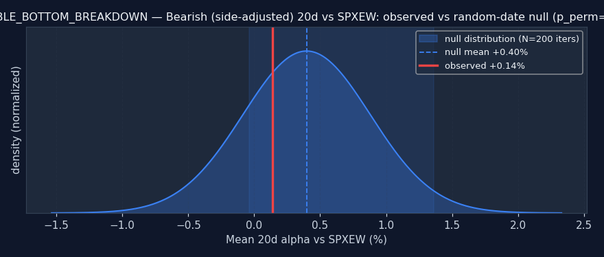Reading this: the random-date null is: for each ticker, sample N random dates and compute the same alpha — what alpha does a signal with no information produce? If the signal's observed alpha beats the null (pperm≤0.05), it's adding real information. If it's inside or worse than the null, the signal doesn't add value over random firing — any observed alpha is either noise or a universe artifact.