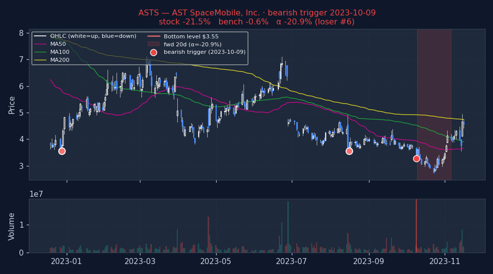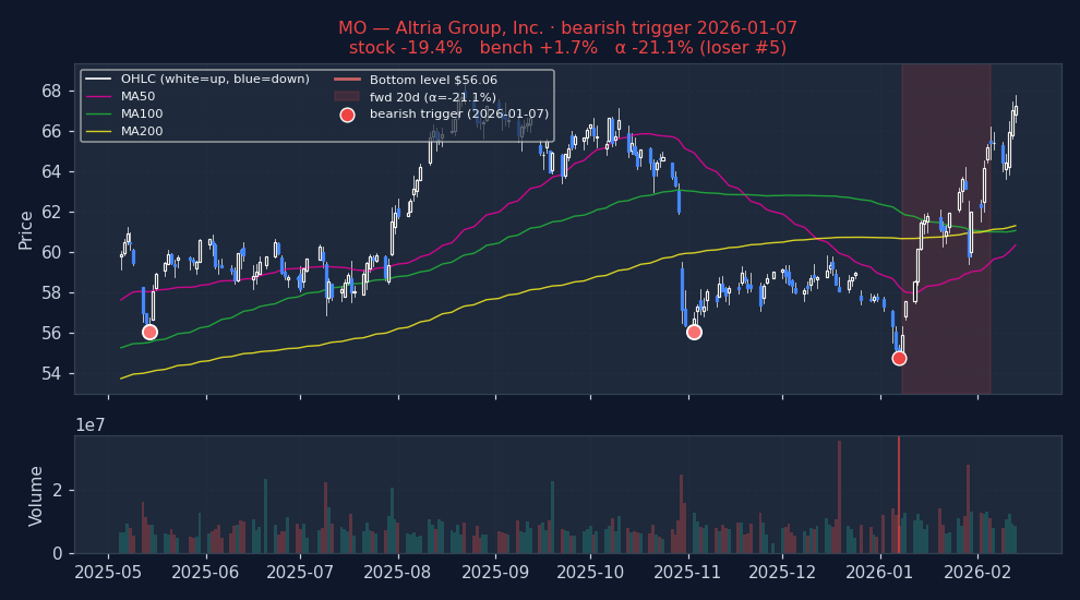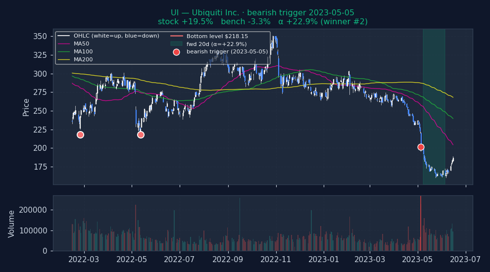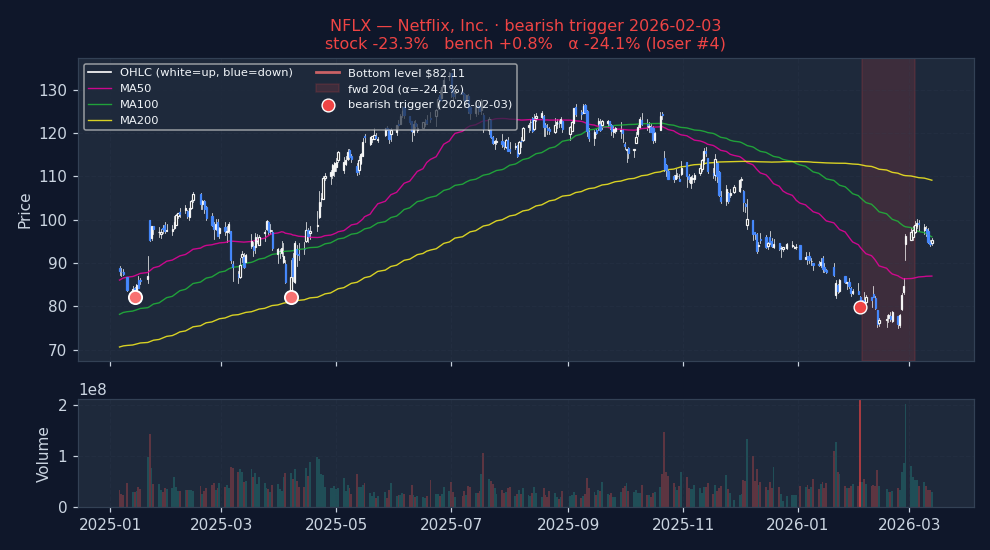 Six recent bearish DOUBLE_BOTTOM_BREAKDOWN triggers on US mega-caps, filtered to |alpha| ≤ 25% to exclude catalyst-driven outliers (earnings surprises, M&A, binary events). The first three are the strongest outcomes — what the signal looks like when it works. The last three are the weakest — what the signal looks like when it fails. Each chart shows the stock's price with signal-appropriate technical overlays (e.g. MACD subpanel on MACD pages, Bollinger Bands on Bollinger pages, the 52-week trailing max line on 52w-high pages), a dot marking the trigger date, and the forward window shaded (green when the signal was right, red when it wasn't). Click any chart to open full-size.