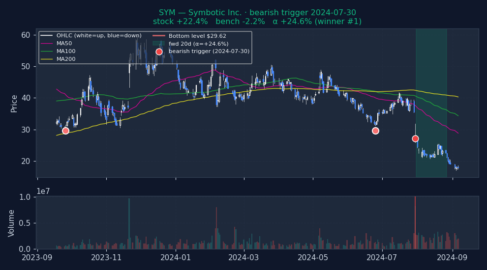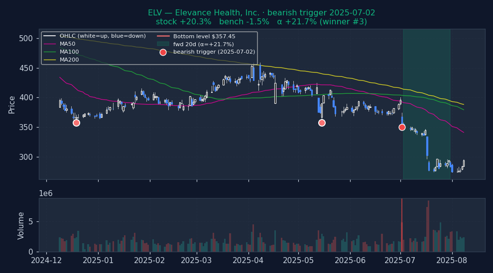 ↓ Bearish triggers negative alpha = signal was right (stock underperformed market)