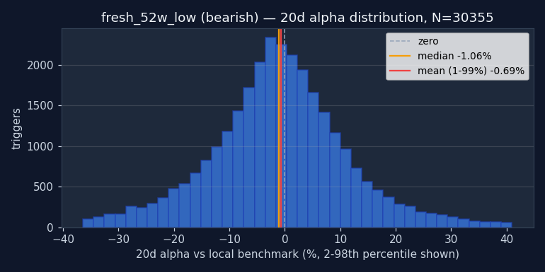 - Volume-confirm the capitulation — Fresh 52w low on 2× avg volume vs thin volume is different in nature. Vol filter may concentrate the −0.69 alpha further. Testable.