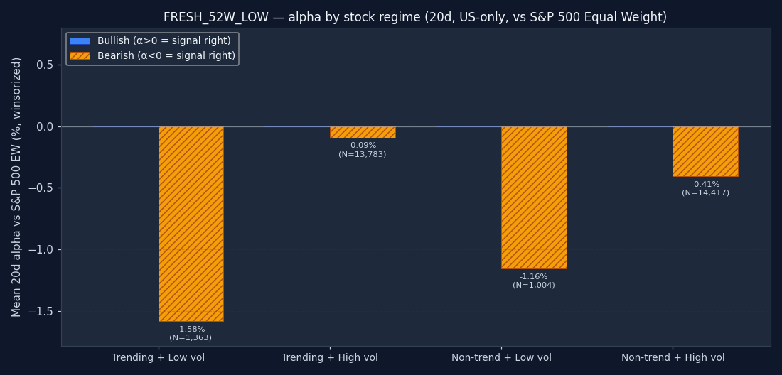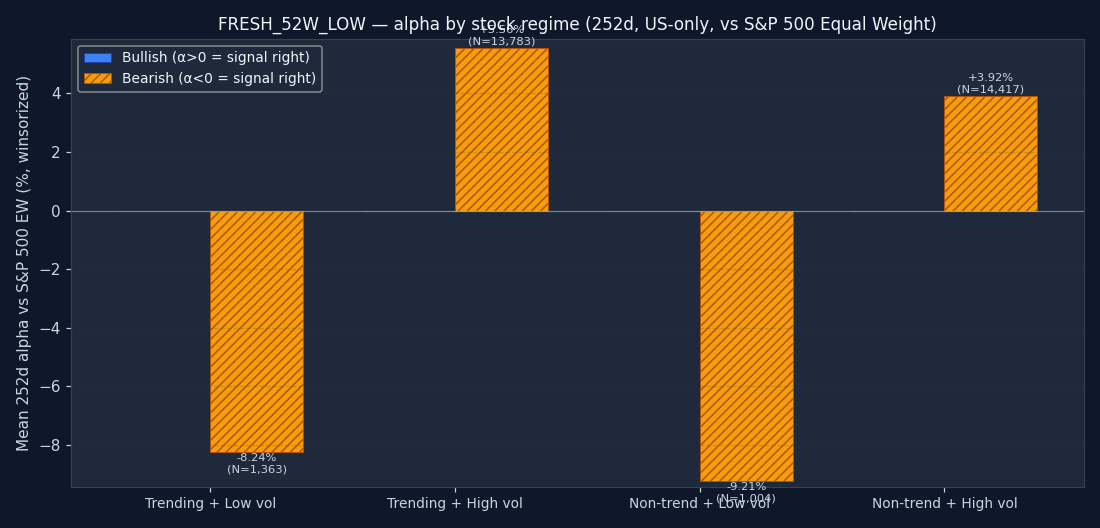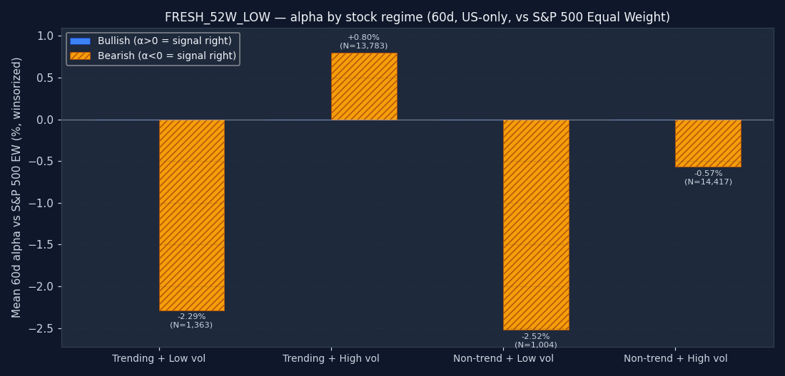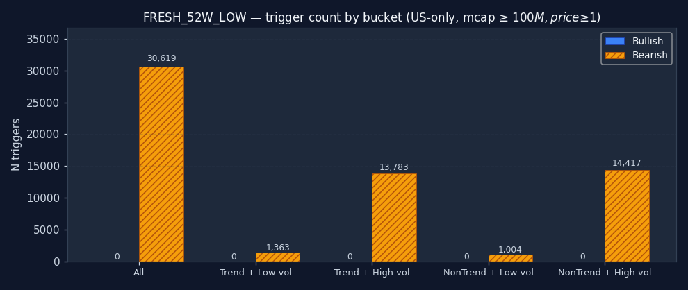 The signal's bucket distribution is itself informative. If 50%+ of all FRESH_52W_LOW triggers fire in the "non-trending + high vol" quadrant, the signal is structurally a chop-market event — regardless of what its textbook definition claims. Bullish and bearish are shown separately; counts are across the full US-only sample after the mcap and price floor.