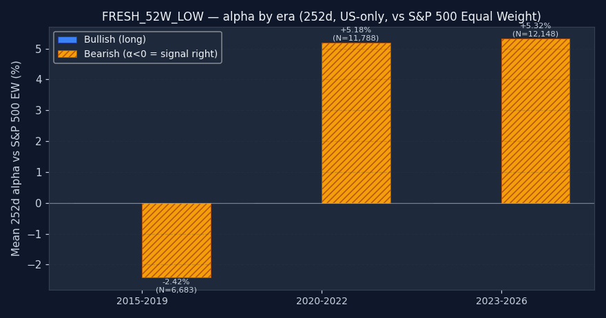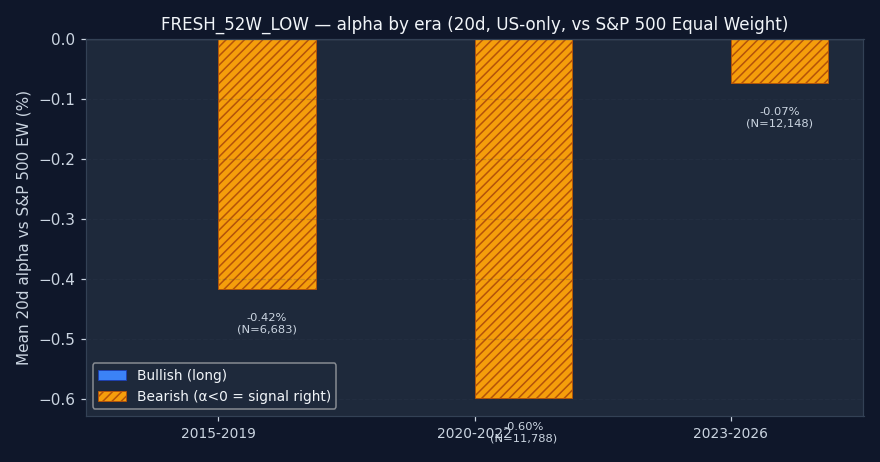 Weakest outcomes (what FRESH_52W_LOW looks like when it fails)