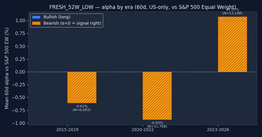 A multi-year average can hide major instability. We split the sample into three non-overlapping windows: 2015–2019 (pre-COVID, normalized monetary policy), 2020–2022 (pandemic crash + recovery + rate-shock bear), and 2023+ (post-ZIRP, AI megacap rally). If a signal's alpha is positive overall but comes entirely from one era, that's a red flag — the conditions that produced it may not repeat. A robust signal shows a consistent sign across all non-empty buckets. Note: this signal requires 260 trading days of prior history per ticker. Triggers on tickers with less history are excluded, which is why the earliest bucket may have zero observations.
