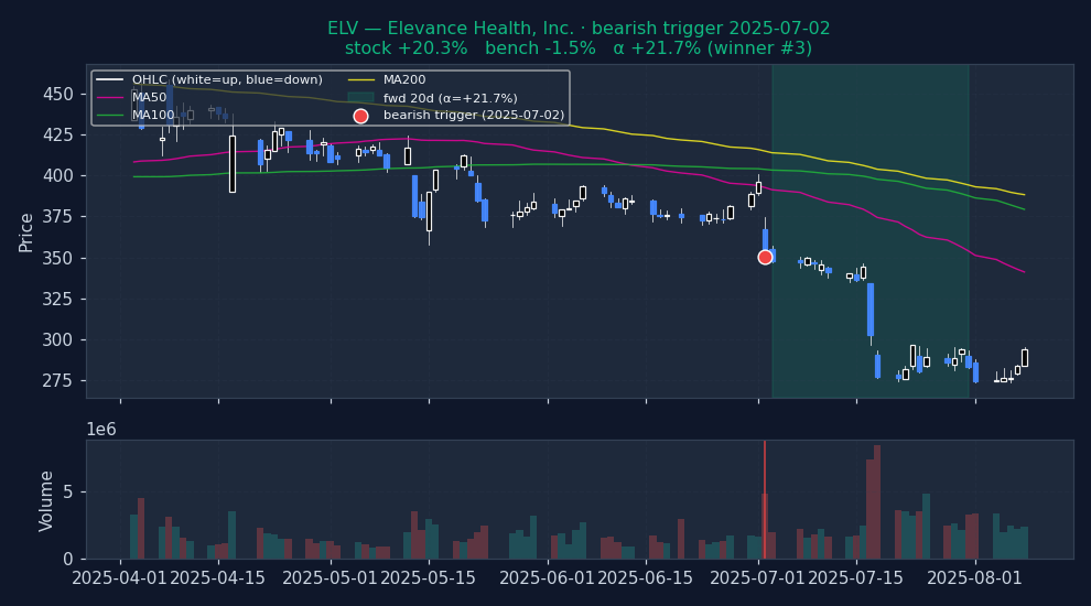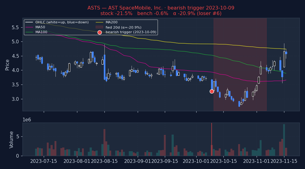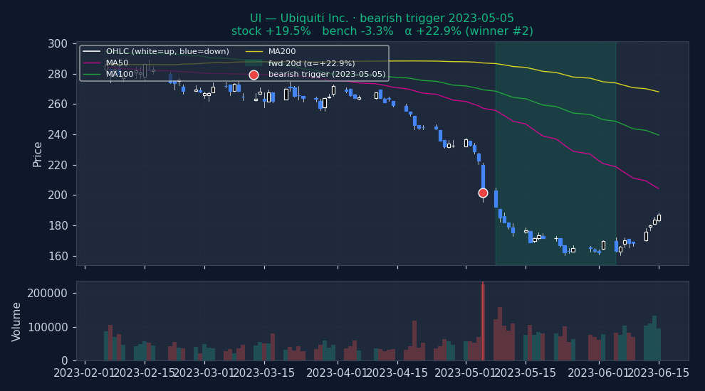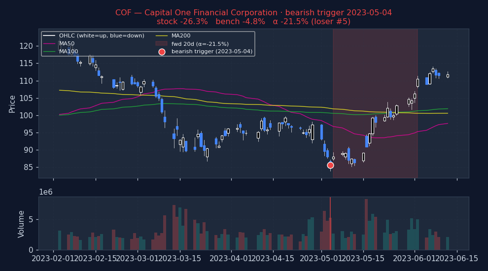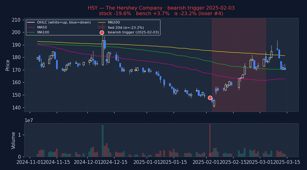 ↓ Bearish triggers negative alpha = signal was right (stock underperformed market)