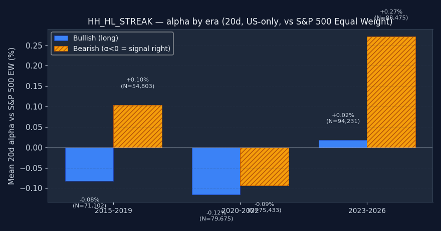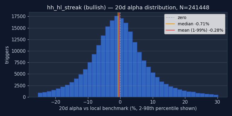 Caution recommended. Bullish 20d alpha is -0.28% and worse than random — triggering on random dates would have produced better long-side returns. Either direction fails the "beats random" test. Don't use Highs/Lows streak as a standalone entry trigger. It may still be useful as part of a composite (section 4).