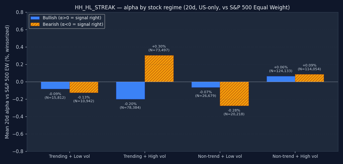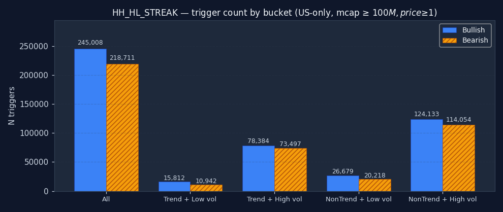 The signal's bucket distribution is itself informative. If 50%+ of all HH_HL_STREAK triggers fire in the "non-trending + high vol" quadrant, the signal is structurally a chop-market event — regardless of what its textbook definition claims. Bullish and bearish are shown separately; counts are across the full US-only sample after the mcap and price floor.