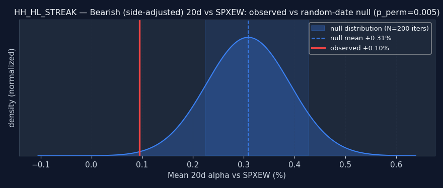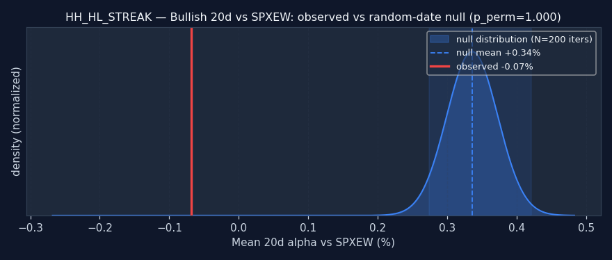 Reading this: the random-date null is: for each ticker, sample N random dates and compute the same alpha — what alpha does a signal with no information produce? If the signal's observed alpha beats the null (pperm≤0.05), it's adding real information. If it's inside or worse than the null, the signal doesn't add value over random firing — any observed alpha is either noise or a universe artifact.