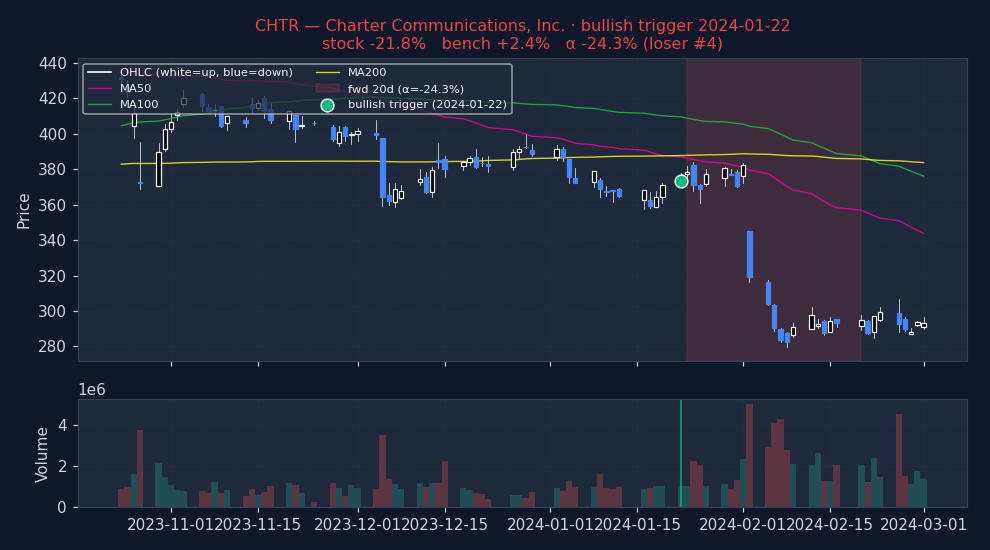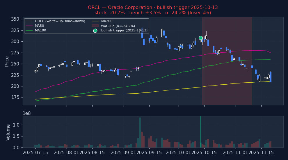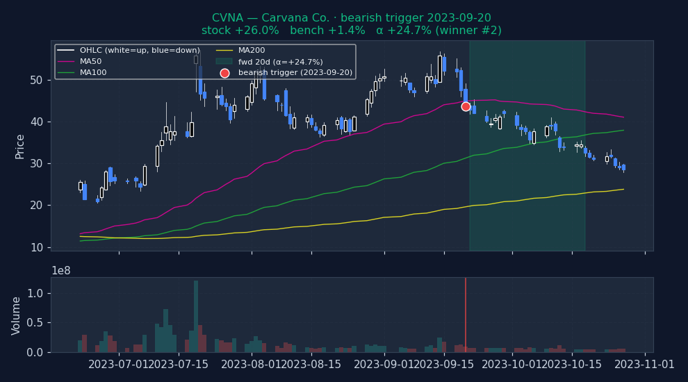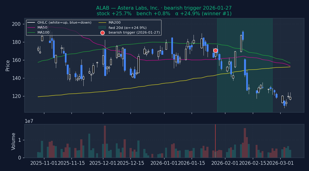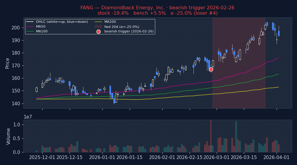 ↓ Bearish triggers negative alpha = signal was right (stock underperformed market)
