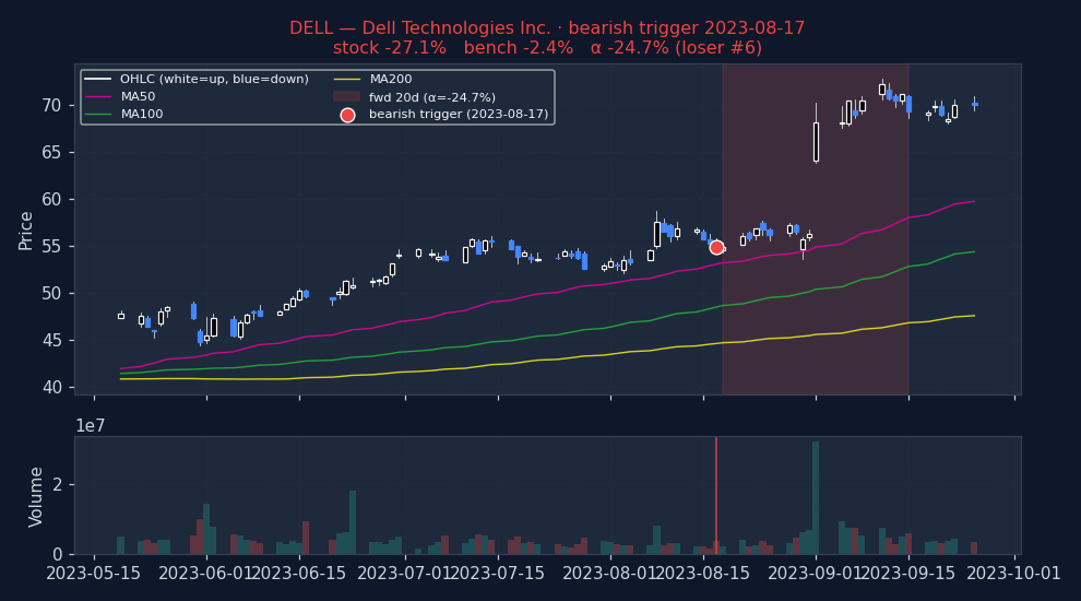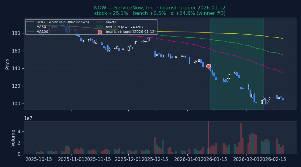 Six recent bearish HH_HL_STREAK triggers on US mega-caps, filtered to |alpha| ≤ 25% to exclude catalyst-driven outliers (earnings surprises, M&A, binary events). The first three are the strongest outcomes — what the signal looks like when it works. The last three are the weakest — what the signal looks like when it fails. Each chart shows the stock's price with signal-appropriate technical overlays (e.g. MACD subpanel on MACD pages, Bollinger Bands on Bollinger pages, the 52-week trailing max line on 52w-high pages), a dot marking the trigger date, and the forward window shaded (green when the signal was right, red when it wasn't). Click any chart to open full-size.