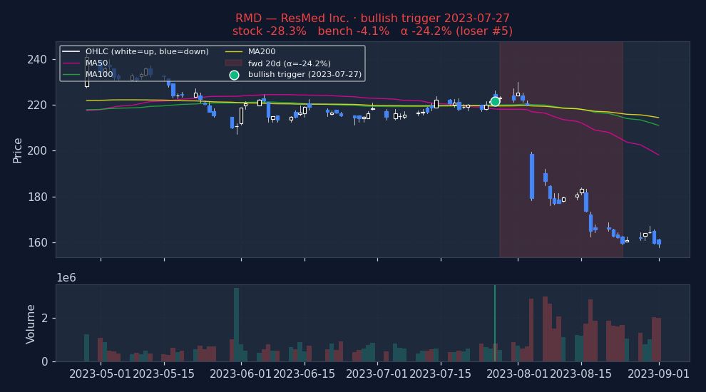 How to read. Entry at open of T+1 (one trading day after the signal fires on close of T). 20d = open T+1 to close T+20. Alpha = stock return − benchmark return over the same window (Convention A, single-sided, textbook). For bullish triggers, POSITIVE alpha = signal was right. For bearish triggers, NEGATIVE alpha = signal was right (stock underperformed market). No sign-flipping; the direction of the bet determines what "good" looks like. Per-stock regime is each stock's own ADX(14) and RV(20) at the trigger date — not market-wide state.