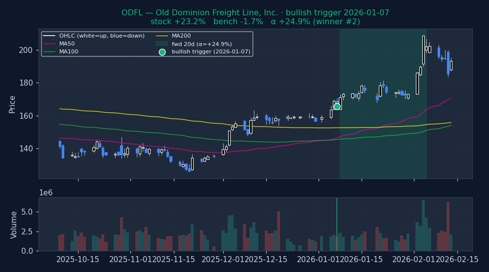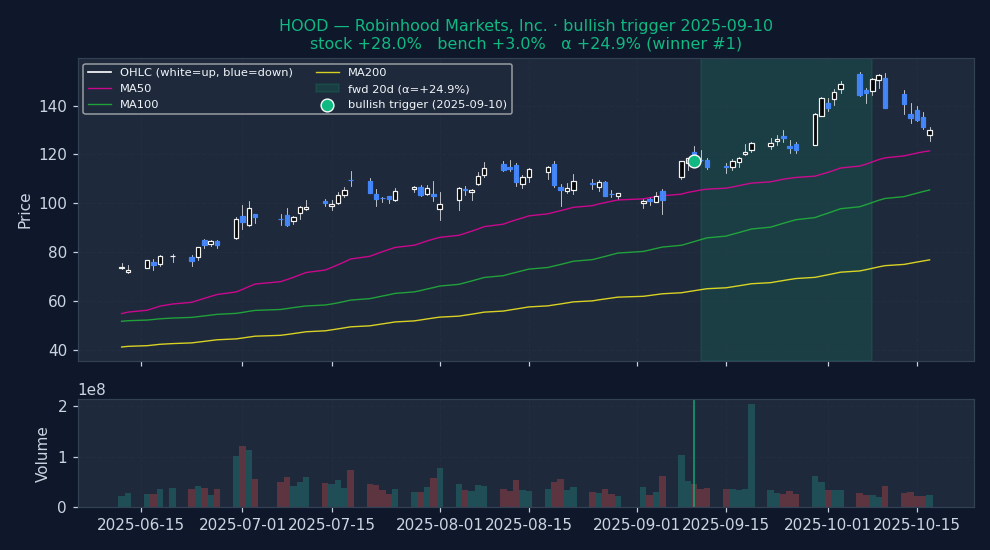 Six recent bullish HH_HL_STREAK triggers on US mega-caps, filtered to |alpha| ≤ 25% to exclude catalyst-driven outliers (earnings surprises, M&A, binary events). The first three are the strongest outcomes — what the signal looks like when it works. The last three are the weakest — what the signal looks like when it fails. Each chart shows the stock's price with signal-appropriate technical overlays (e.g. MACD subpanel on MACD pages, Bollinger Bands on Bollinger pages, the 52-week trailing max line on 52w-high pages), a dot marking the trigger date, and the forward window shaded (green when the signal was right, red when it wasn't). Click any chart to open full-size.