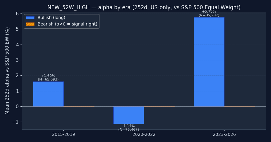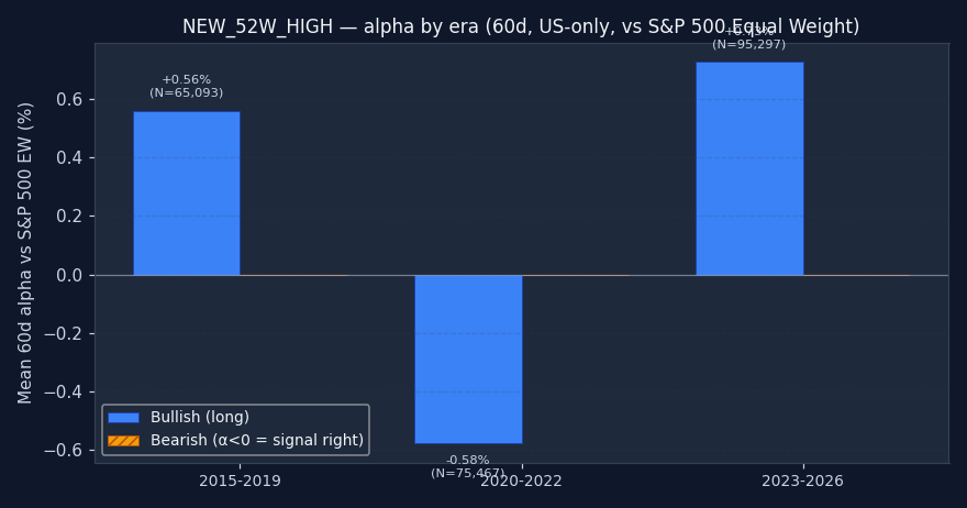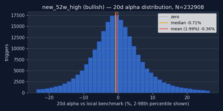 Caution recommended. Bullish 20d alpha is -0.36% and worse than random — triggering on random dates would have produced better long-side returns. Either direction fails the "beats random" test. Don't use 52-Week New High as a standalone entry trigger. It may still be useful as part of a composite (section 4).