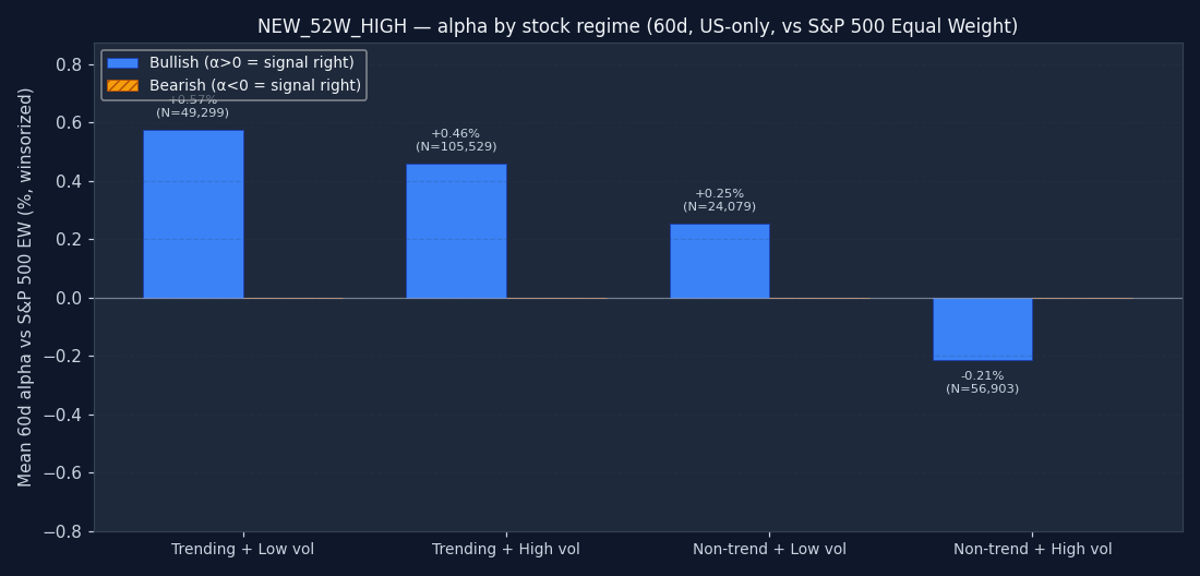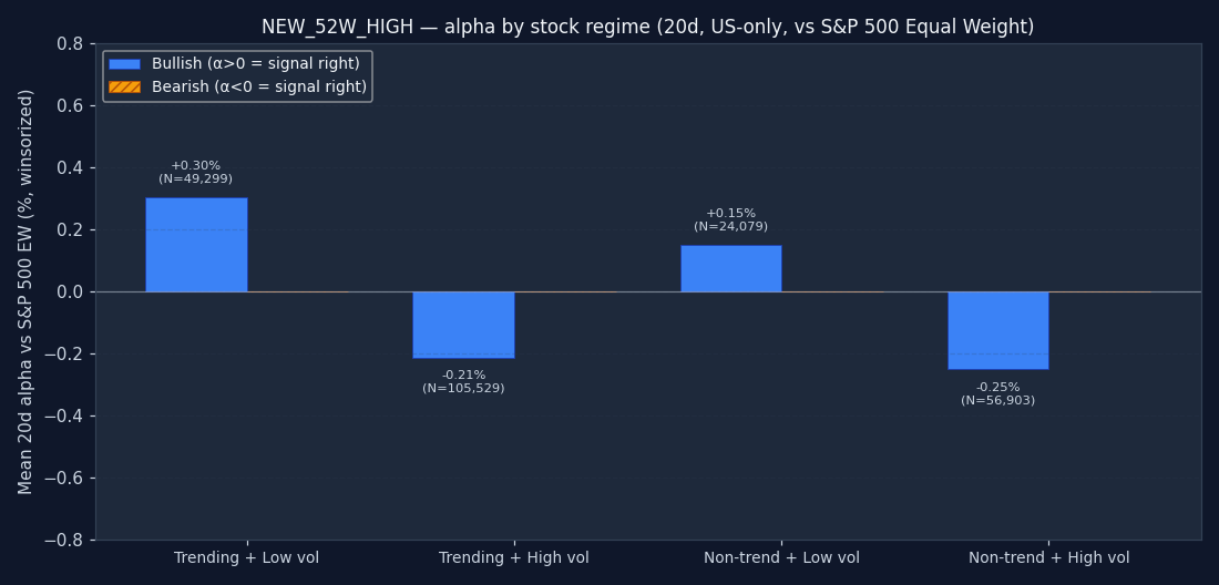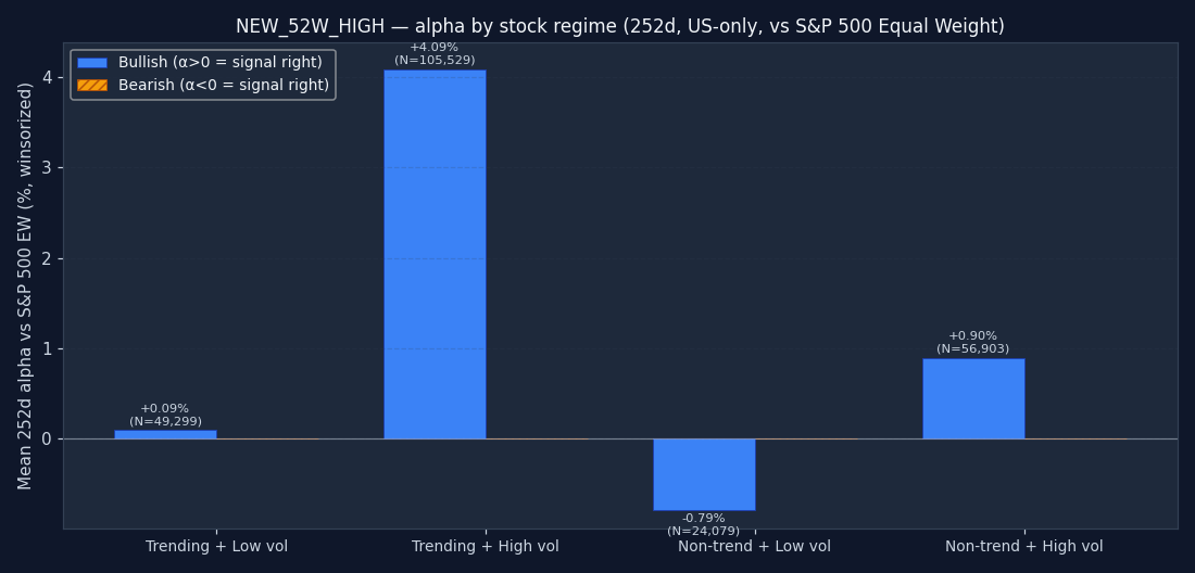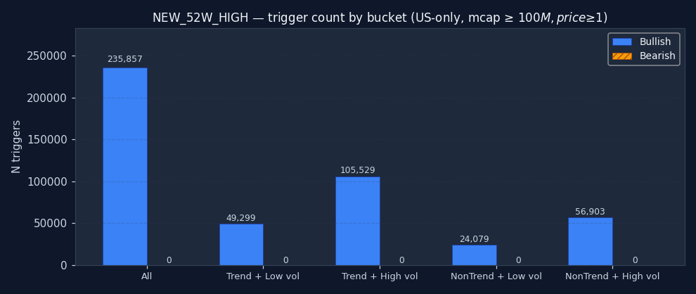 The signal's bucket distribution is itself informative. If 50%+ of all NEW_52W_HIGH triggers fire in the "non-trending + high vol" quadrant, the signal is structurally a chop-market event — regardless of what its textbook definition claims. Bullish and bearish are shown separately; counts are across the full US-only sample after the mcap and price floor.