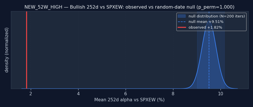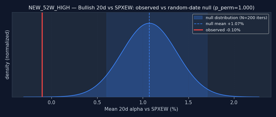 Reading this: the random-date null is: for each ticker, sample N random dates and compute the same alpha — what alpha does a signal with no information produce? If the signal's observed alpha beats the null (pperm≤0.05), it's adding real information. If it's inside or worse than the null, the signal doesn't add value over random firing — any observed alpha is either noise or a universe artifact.