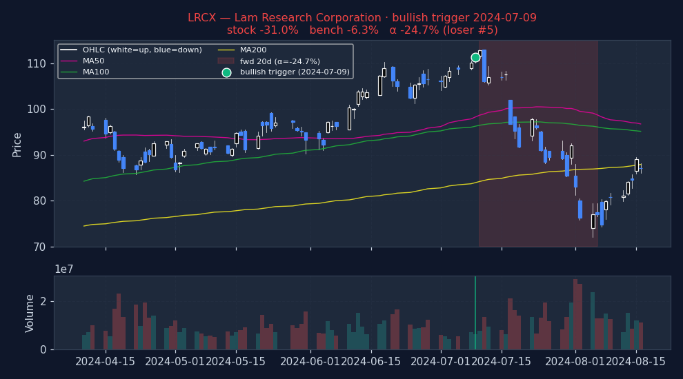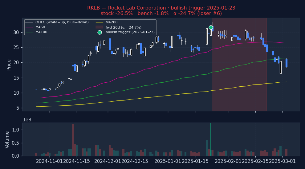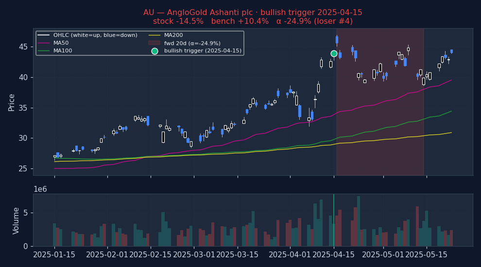 How to read. Entry at open of T+1 (one trading day after the signal fires on close of T). 20d = open T+1 to close T+20. Alpha = stock return − benchmark return over the same window (Convention A, single-sided, textbook). For bullish triggers, POSITIVE alpha = signal was right. For bearish triggers, NEGATIVE alpha = signal was right (stock underperformed market). No sign-flipping; the direction of the bet determines what "good" looks like. Per-stock regime is each stock's own ADX(14) and RV(20) at the trigger date — not market-wide state.