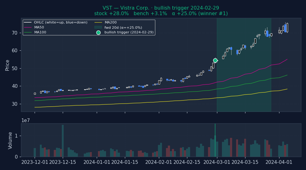 - Best bullish setup: Trending + Low vol — alpha -0.11% / 20d on 49,299 historical triggers.