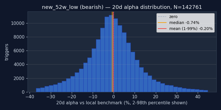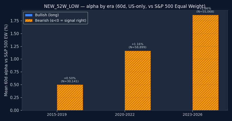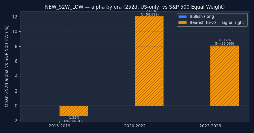 - Regime-gate on breadth — Bearish 52w new low worked in 2020+ narrow-breadth market; may reverse in a broad-breadth market. Conditioning on 'market breadth < 55%' would make the signal regime-adaptive. Testable.
