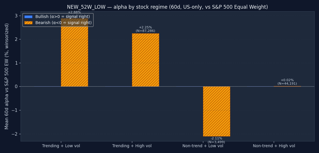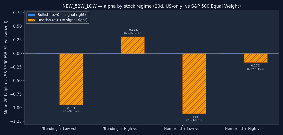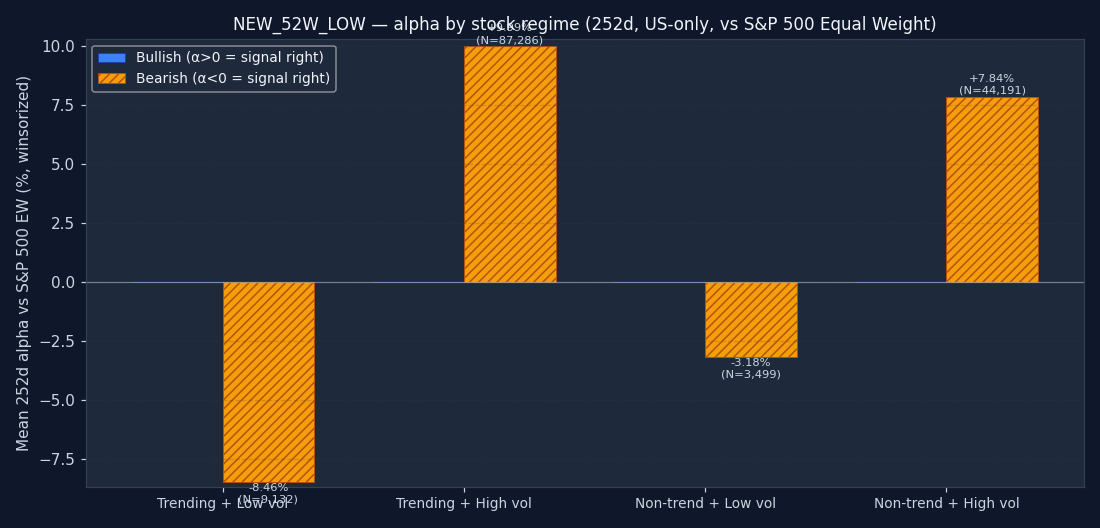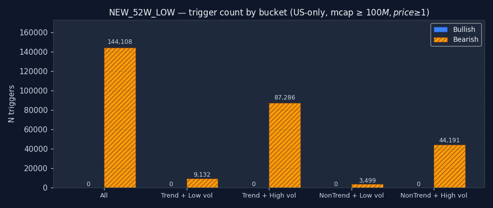 The signal's bucket distribution is itself informative. If 50%+ of all NEW_52W_LOW triggers fire in the "non-trending + high vol" quadrant, the signal is structurally a chop-market event — regardless of what its textbook definition claims. Bullish and bearish are shown separately; counts are across the full US-only sample after the mcap and price floor.