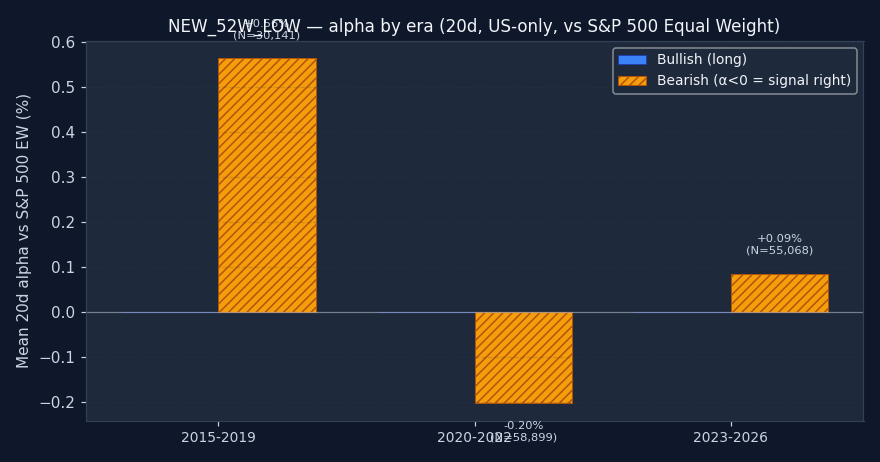 - Worst era for bearish: 2023-2026 — alpha -0.55% / 20d.