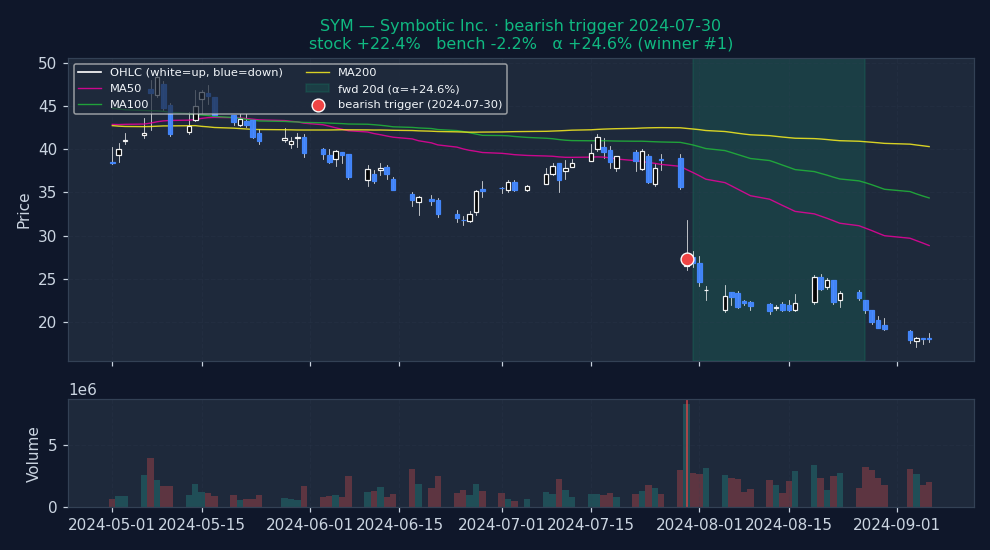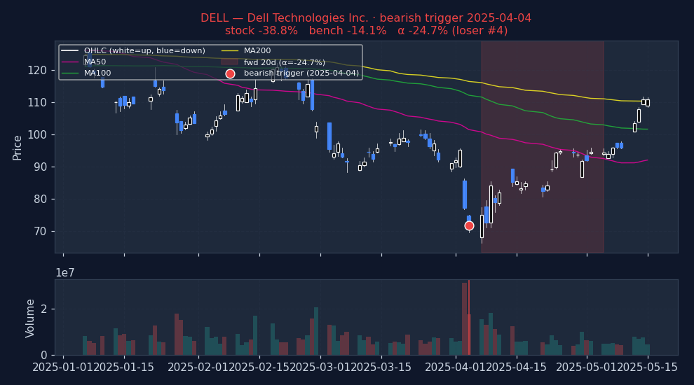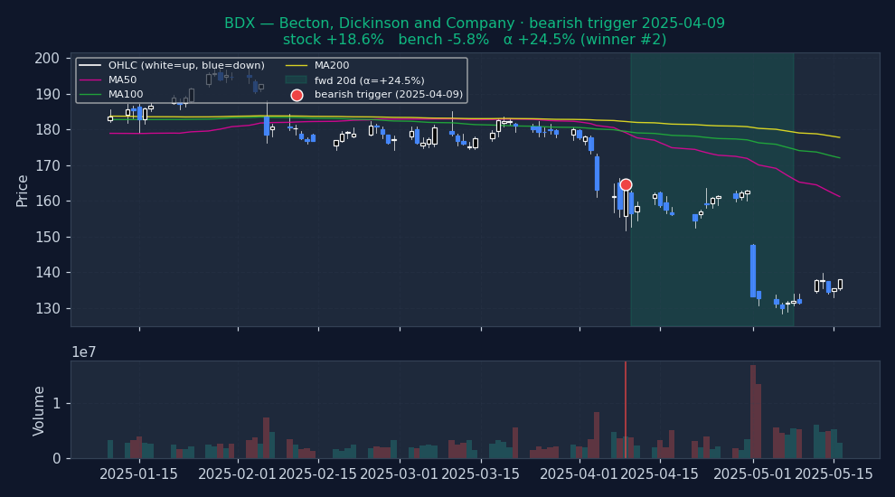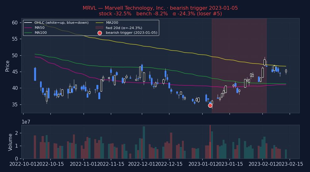 ↓ Bearish triggers negative alpha = signal was right (stock underperformed market)