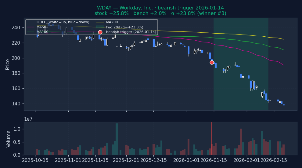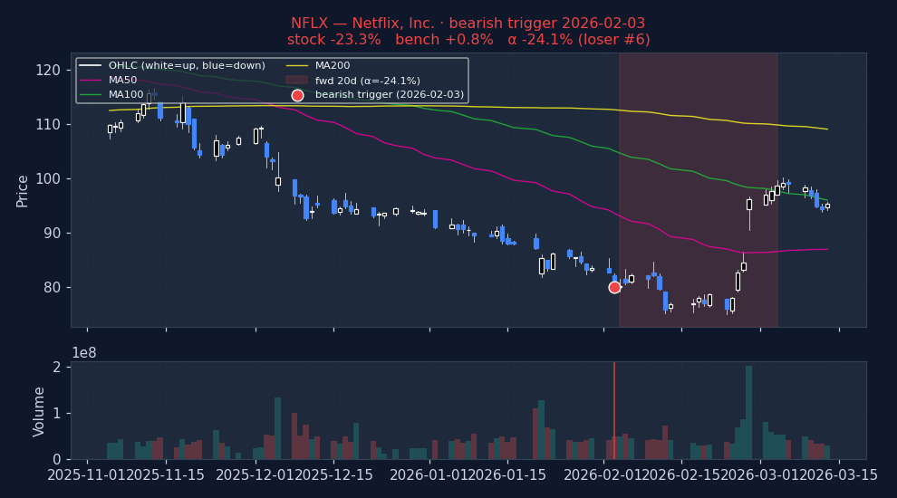 Six recent bearish NEW_52W_LOW triggers on US mega-caps, filtered to |alpha| ≤ 25% to exclude catalyst-driven outliers (earnings surprises, M&A, binary events). The first three are the strongest outcomes — what the signal looks like when it works. The last three are the weakest — what the signal looks like when it fails. Each chart shows the stock's price with signal-appropriate technical overlays (e.g. MACD subpanel on MACD pages, Bollinger Bands on Bollinger pages, the 52-week trailing max line on 52w-high pages), a dot marking the trigger date, and the forward window shaded (green when the signal was right, red when it wasn't). Click any chart to open full-size.