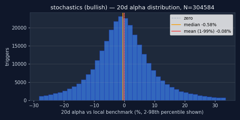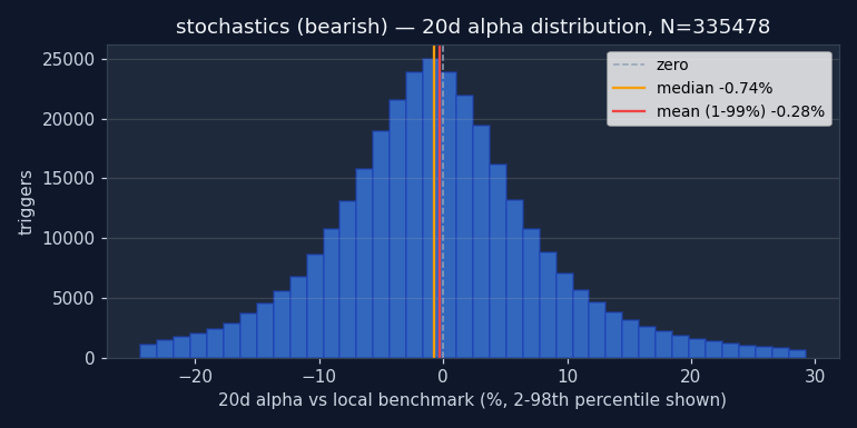 Caution recommended. Bullish 20d alpha is -0.08% and worse than random — triggering on random dates would have produced better long-side returns. Either direction fails the "beats random" test. Don't use Stochastics (Slow) as a standalone entry trigger. It may still be useful as part of a composite (section 4).