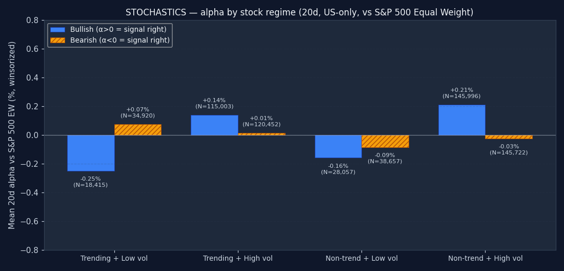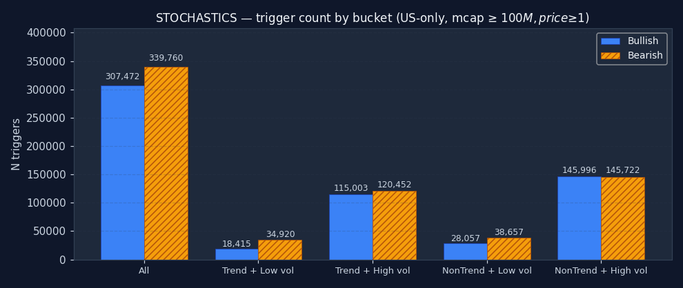 The signal's bucket distribution is itself informative. If 50%+ of all STOCHASTICS triggers fire in the "non-trending + high vol" quadrant, the signal is structurally a chop-market event — regardless of what its textbook definition claims. Bullish and bearish are shown separately; counts are across the full US-only sample after the mcap and price floor.