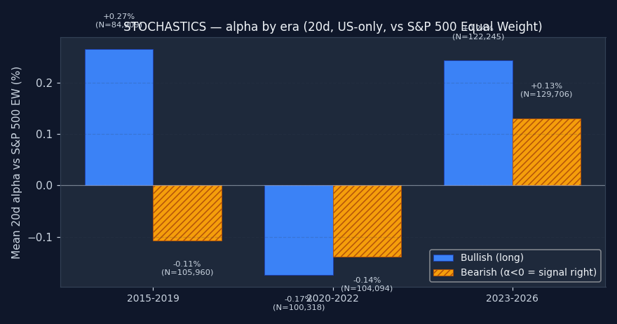 - Pair with trend filter — Adding a 50DMA downtrend filter to bearish Stochastics should concentrate the alpha. Untested individually but consistent with how the other oscillators behave.