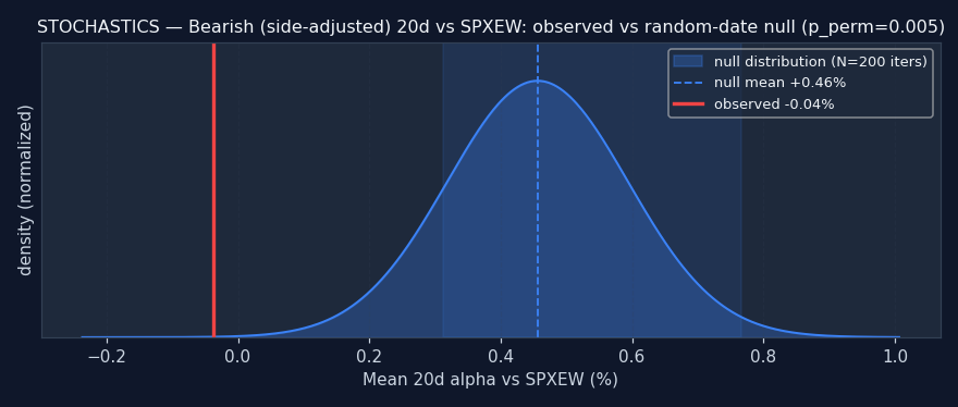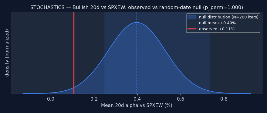 Reading this: the random-date null is: for each ticker, sample N random dates and compute the same alpha — what alpha does a signal with no information produce? If the signal's observed alpha beats the null (pperm≤0.05), it's adding real information. If it's inside or worse than the null, the signal doesn't add value over random firing — any observed alpha is either noise or a universe artifact.