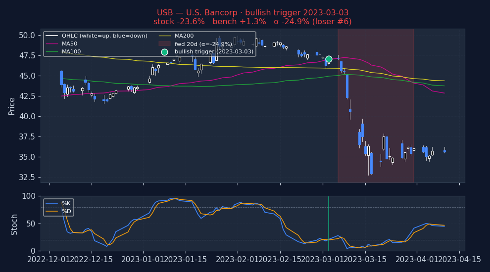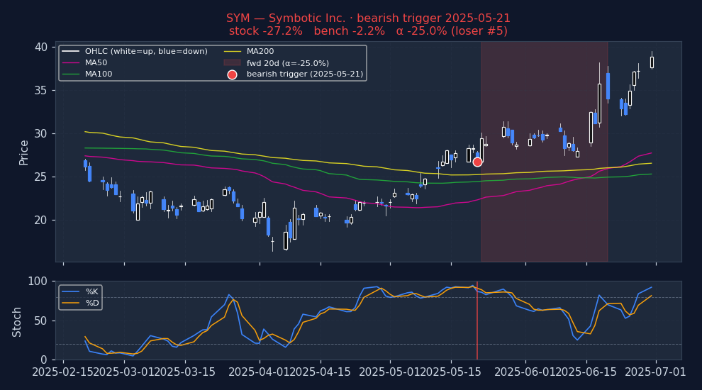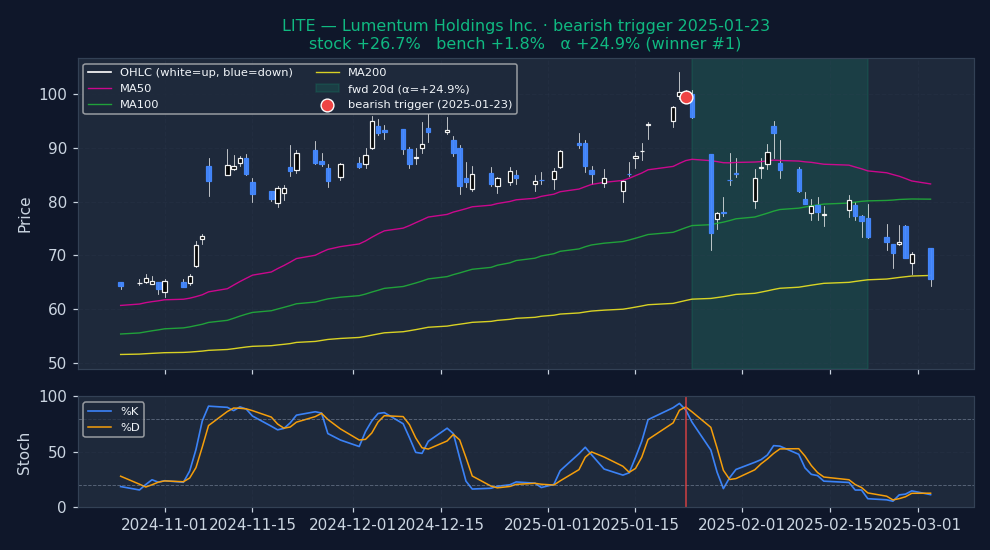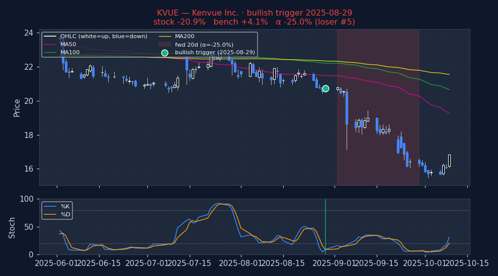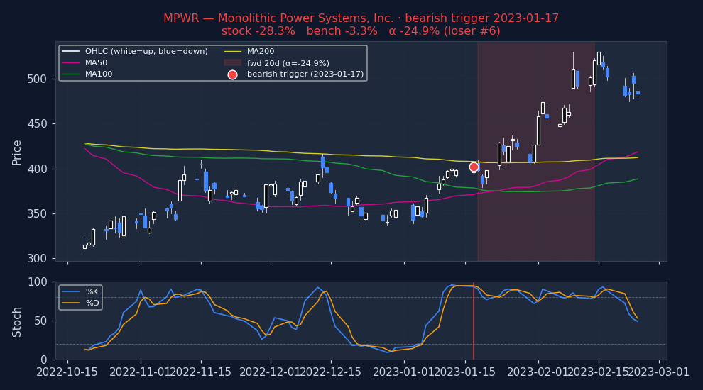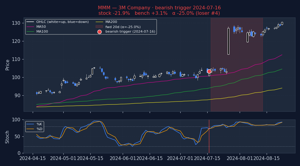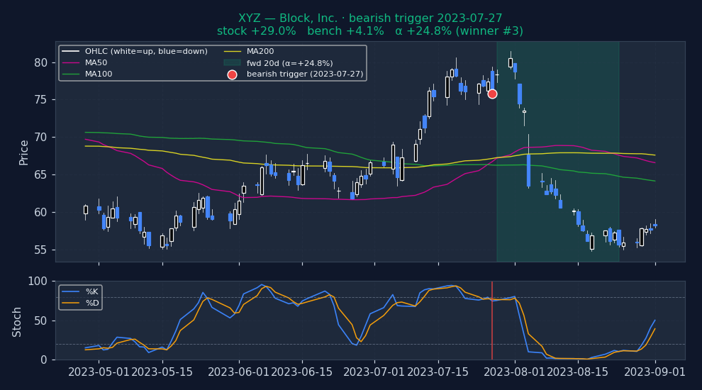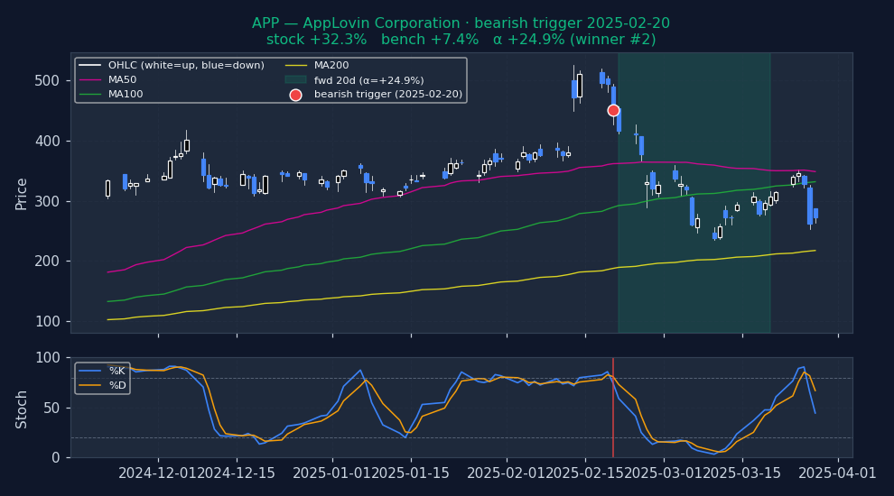 Six recent bearish STOCHASTICS triggers on US mega-caps, filtered to |alpha| ≤ 25% to exclude catalyst-driven outliers (earnings surprises, M&A, binary events). The first three are the strongest outcomes — what the signal looks like when it works. The last three are the weakest — what the signal looks like when it fails. Each chart shows the stock's price with signal-appropriate technical overlays (e.g. MACD subpanel on MACD pages, Bollinger Bands on Bollinger pages, the 52-week trailing max line on 52w-high pages), a dot marking the trigger date, and the forward window shaded (green when the signal was right, red when it wasn't). Click any chart to open full-size.