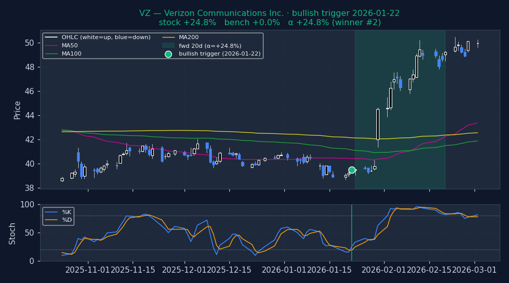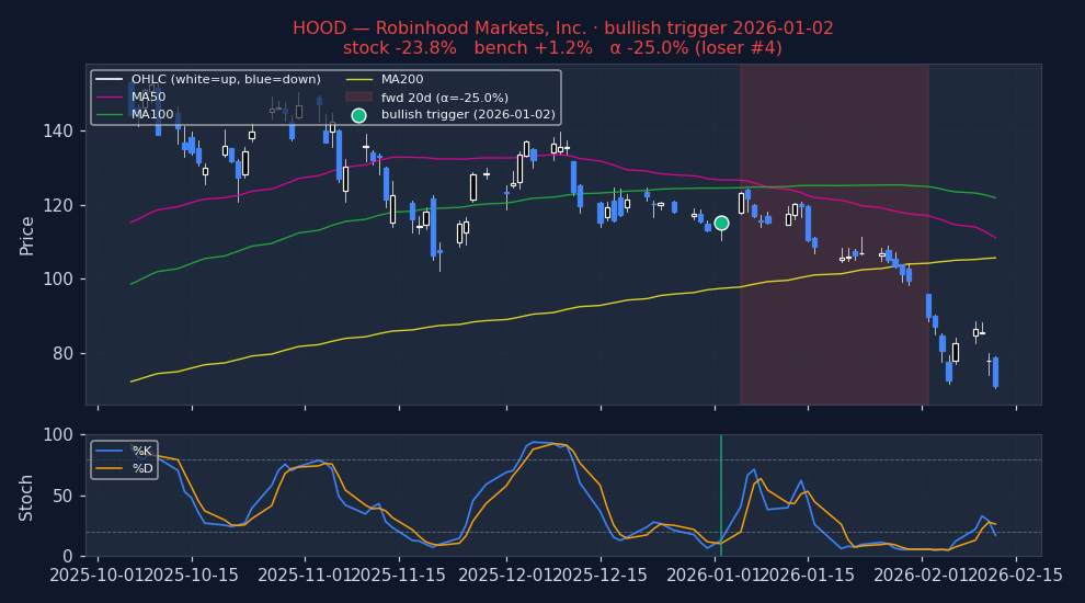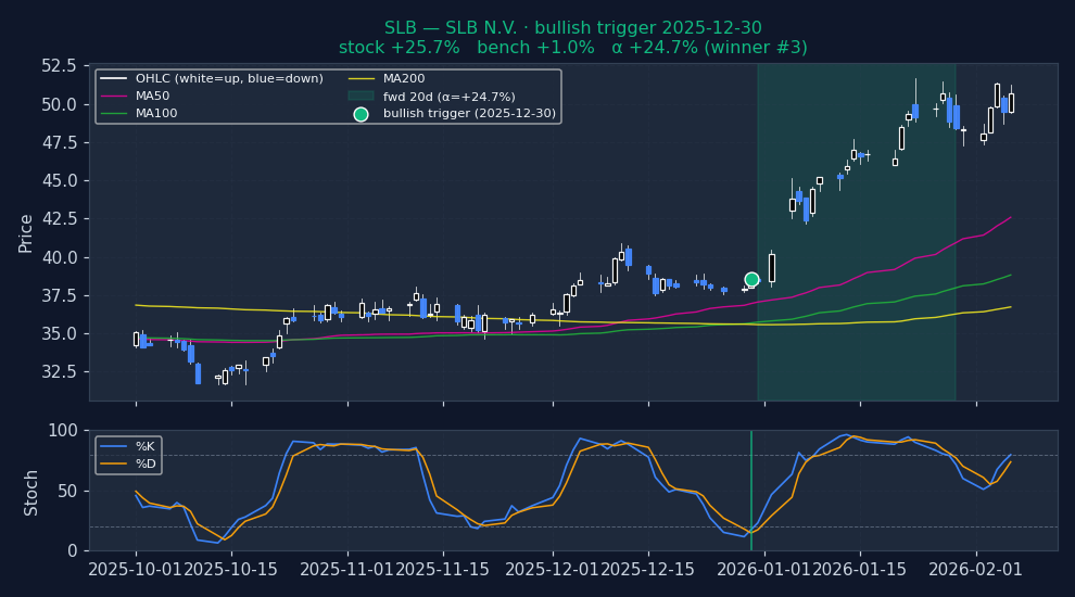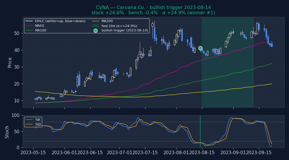 Six recent bullish STOCHASTICS triggers on US mega-caps, filtered to |alpha| ≤ 25% to exclude catalyst-driven outliers (earnings surprises, M&A, binary events). The first three are the strongest outcomes — what the signal looks like when it works. The last three are the weakest — what the signal looks like when it fails. Each chart shows the stock's price with signal-appropriate technical overlays (e.g. MACD subpanel on MACD pages, Bollinger Bands on Bollinger pages, the 52-week trailing max line on 52w-high pages), a dot marking the trigger date, and the forward window shaded (green when the signal was right, red when it wasn't). Click any chart to open full-size.