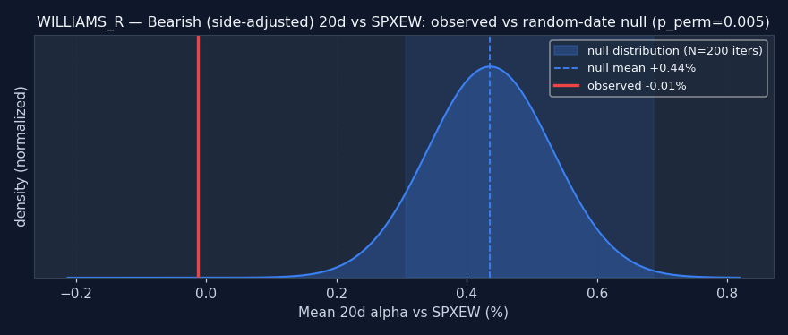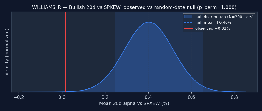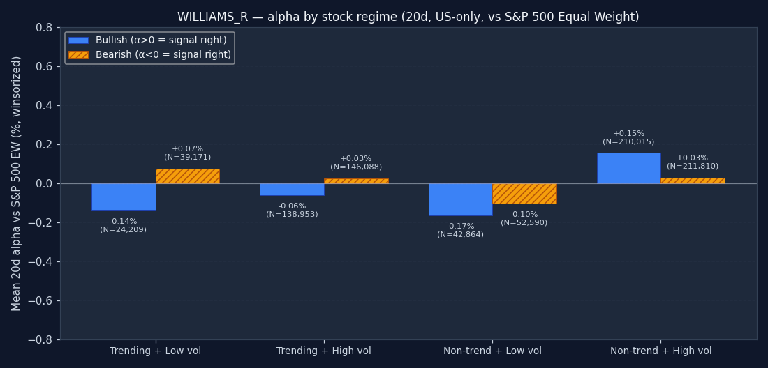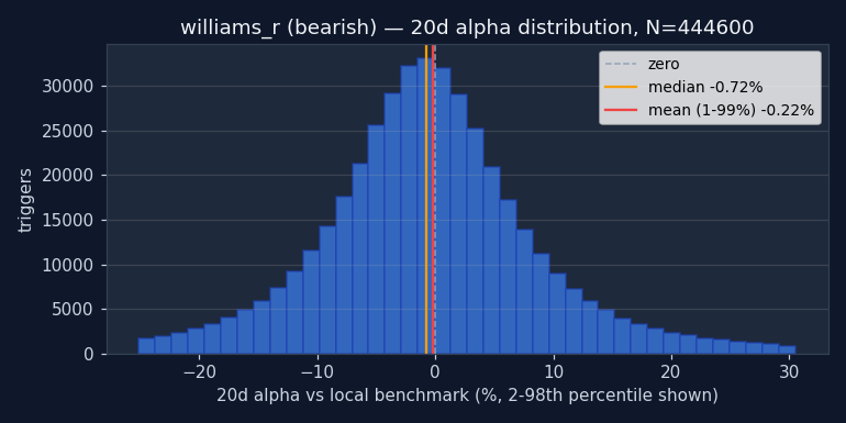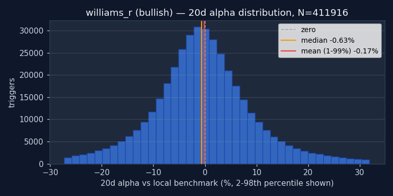 Caution recommended. Bullish 20d alpha is -0.17% and worse than random — triggering on random dates would have produced better long-side returns. Either direction fails the "beats random" test. Don't use Williams %R as a standalone entry trigger. It may still be useful as part of a composite (section 4).