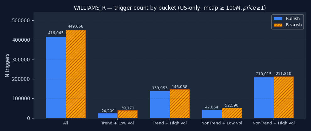 The signal's bucket distribution is itself informative. If 50%+ of all WILLIAMS_R triggers fire in the "non-trending + high vol" quadrant, the signal is structurally a chop-market event — regardless of what its textbook definition claims. Bullish and bearish are shown separately; counts are across the full US-only sample after the mcap and price floor.