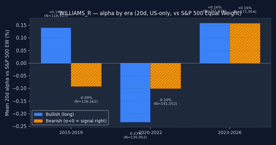Bearish is the tradable side. 449k triggers over 2015-2026 — very large dataset. Alpha compounds from 20d to 60d (−0.22 → −0.58). Entry open T+1. Bullish Williams %R has not produced positive alpha in any horizon, any regime, any sub-period — skip.
