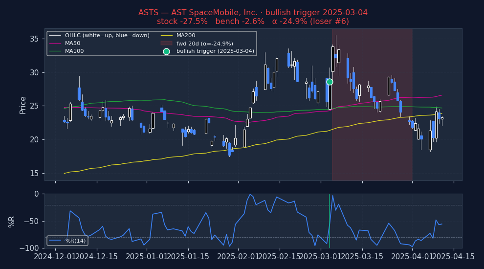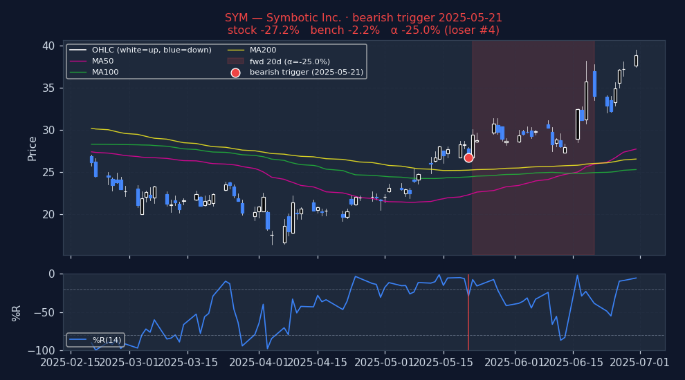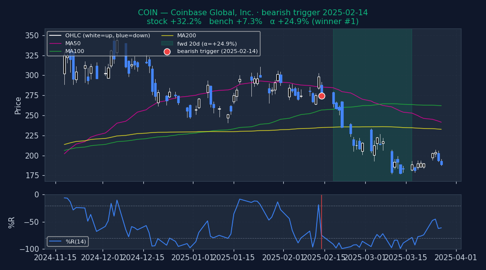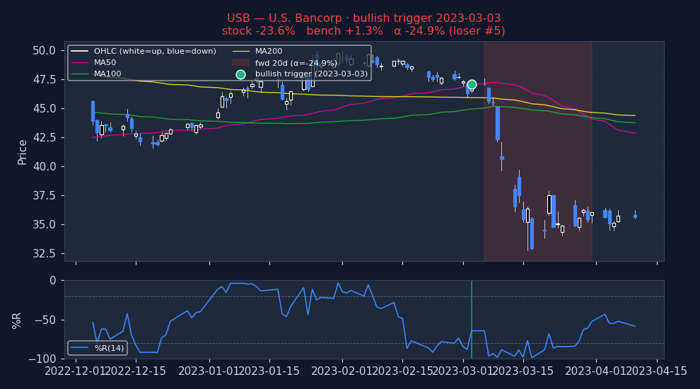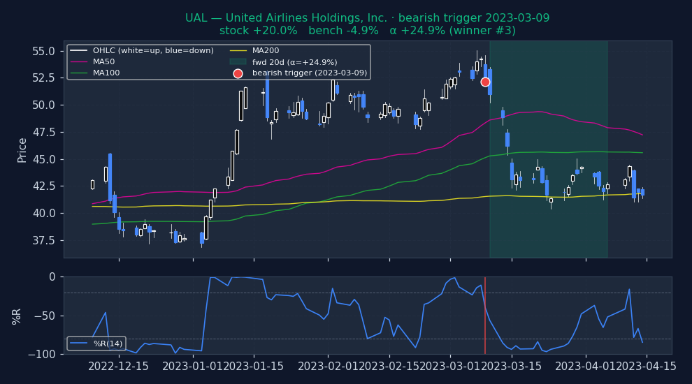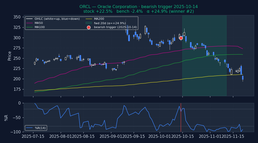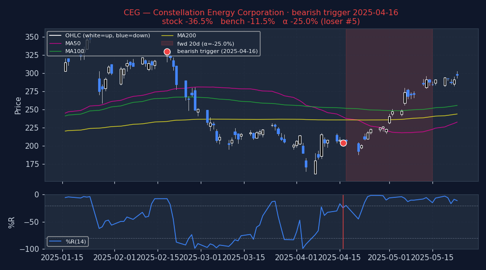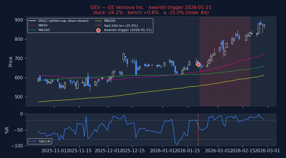 Six recent bearish WILLIAMS_R triggers on US mega-caps, filtered to |alpha| ≤ 25% to exclude catalyst-driven outliers (earnings surprises, M&A, binary events). The first three are the strongest outcomes — what the signal looks like when it works. The last three are the weakest — what the signal looks like when it fails. Each chart shows the stock's price with signal-appropriate technical overlays (e.g. MACD subpanel on MACD pages, Bollinger Bands on Bollinger pages, the 52-week trailing max line on 52w-high pages), a dot marking the trigger date, and the forward window shaded (green when the signal was right, red when it wasn't). Click any chart to open full-size.