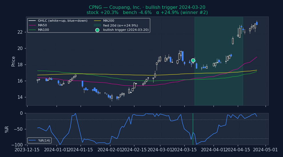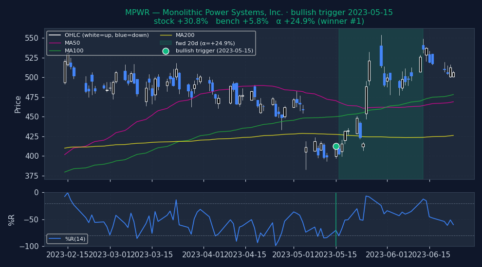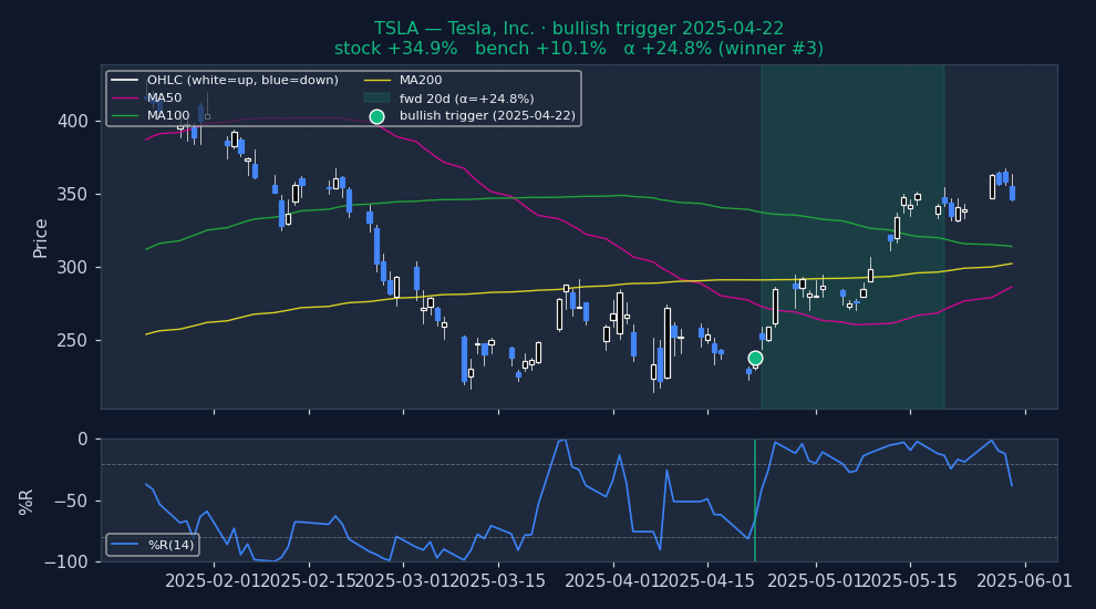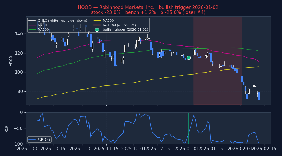 Six recent bullish WILLIAMS_R triggers on US mega-caps, filtered to |alpha| ≤ 25% to exclude catalyst-driven outliers (earnings surprises, M&A, binary events). The first three are the strongest outcomes — what the signal looks like when it works. The last three are the weakest — what the signal looks like when it fails. Each chart shows the stock's price with signal-appropriate technical overlays (e.g. MACD subpanel on MACD pages, Bollinger Bands on Bollinger pages, the 52-week trailing max line on 52w-high pages), a dot marking the trigger date, and the forward window shaded (green when the signal was right, red when it wasn't). Click any chart to open full-size.